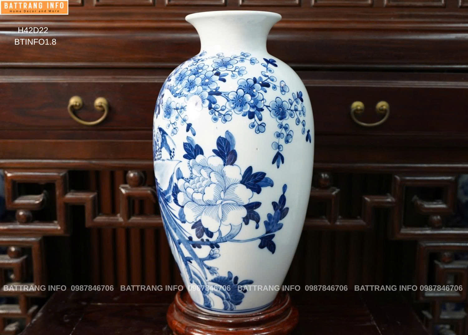 Bình chim trĩ hoa đào vẽ tay cao cấp Chiều cao 42cm Chất liệu Gốm sứ Bát Tràng Họa tiết Chim trĩ – Hoa đào Kỹ thuật Vẽ tay thủ công Bảo hành 1 đổi 1 nếu lỗi kỹ thuật Xuất xứ Làng gốm Bát Tràng, Việt Nam