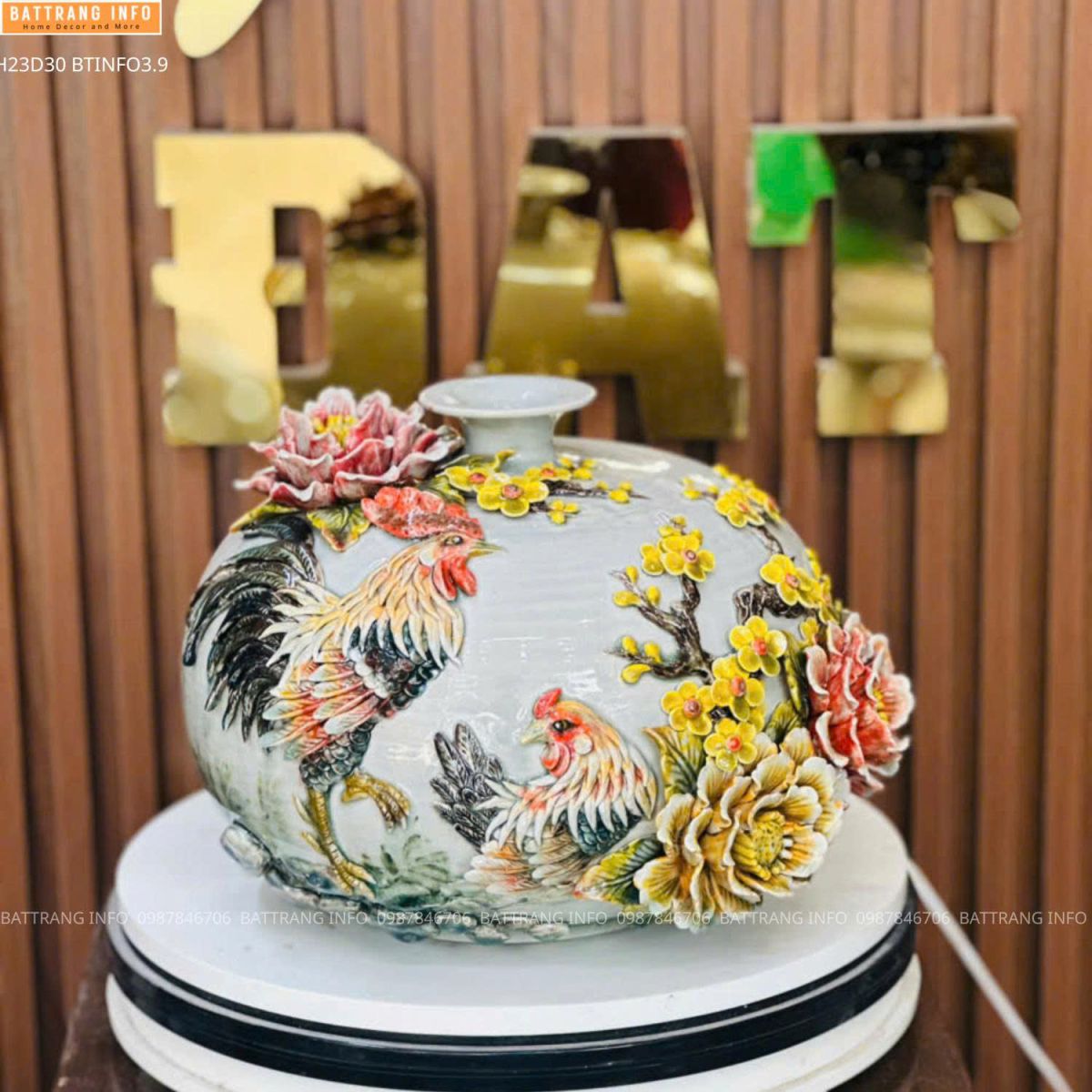Bình hút lộc Kim Kê đắp nổi cao cấp Bát Tràng cao 23cm – Vật phẩm phong thủy chiêu tài, vượng lộc