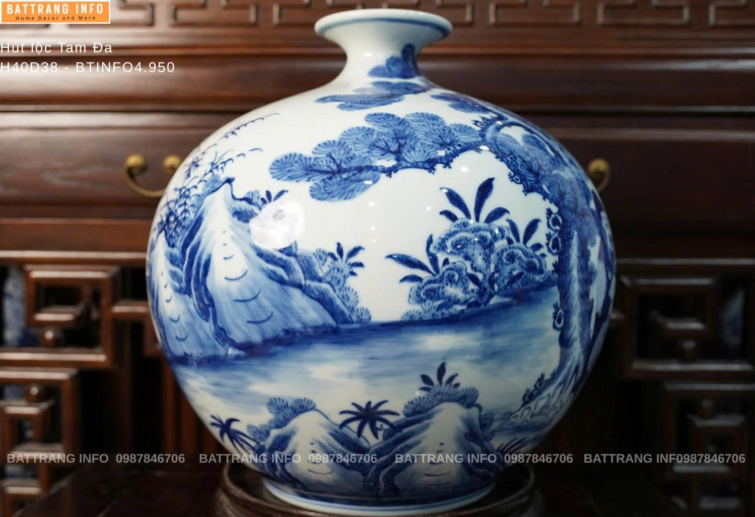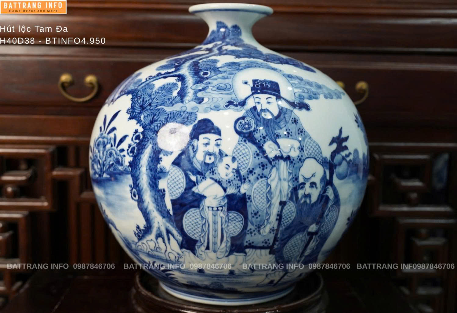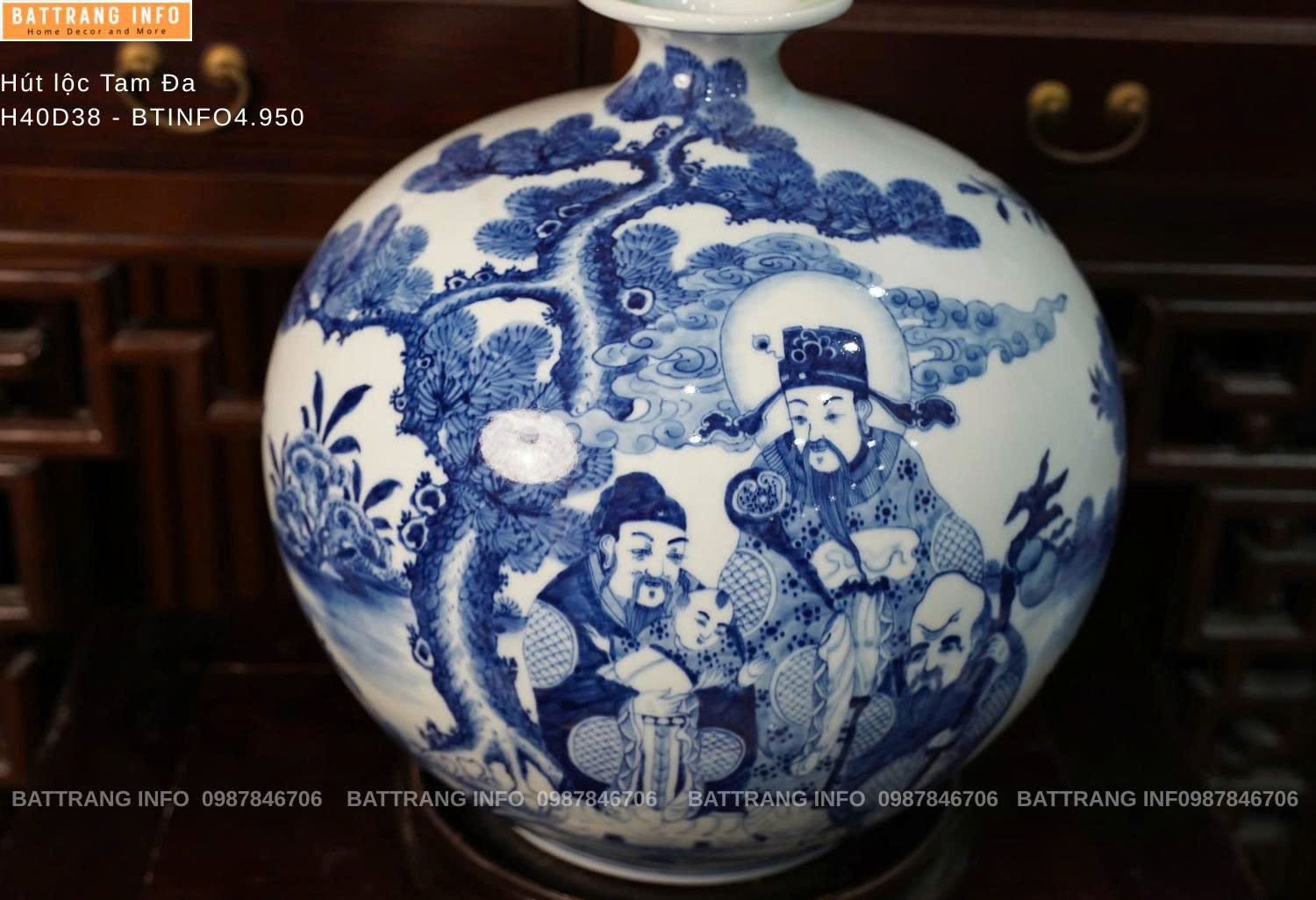 Bình Hút Lộc Men Lam Cao 40cm Tích Tam Đa Vẽ Tay Cao Cấp Bát Tràng