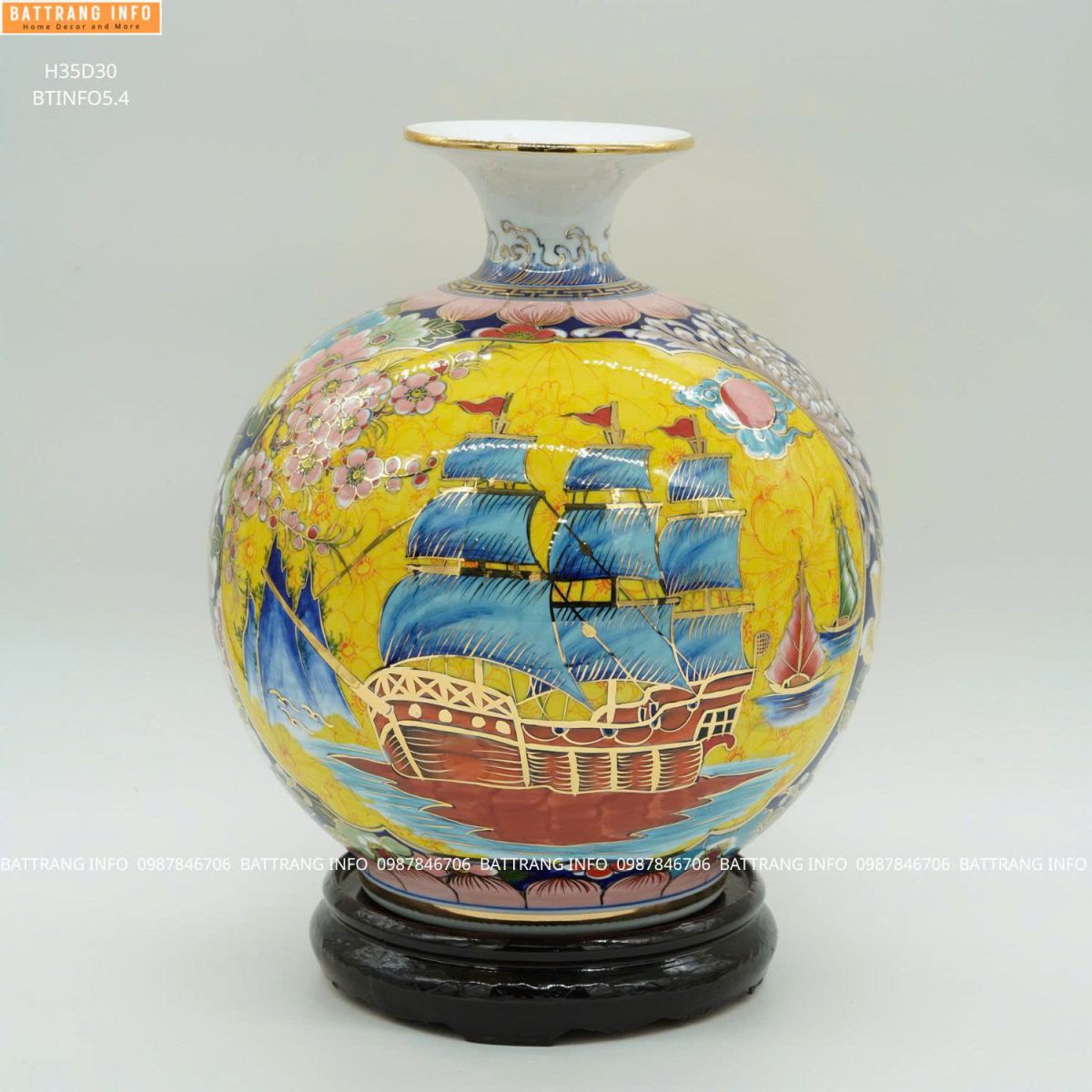 Bình Hút Lộc Nhị Cảnh Thuận Buồm Xuôi Gió & Công Danh Phú Quý – Vẽ Vàng 24K – Cao 35cm – Gốm Sứ Bát Tràng Cao Cấp