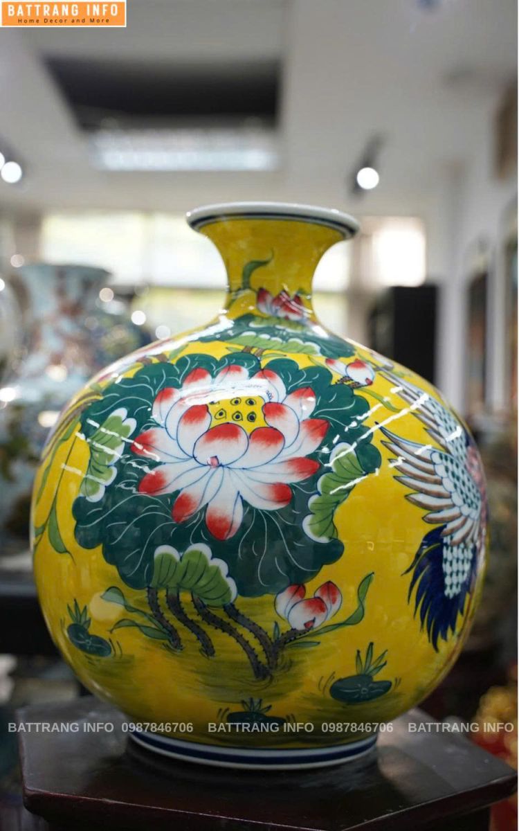 Bình Hút Lộc Sen Hạc Nền Vàng Vẽ Tay Cao 33cm Cao Cấp Bát Tràng