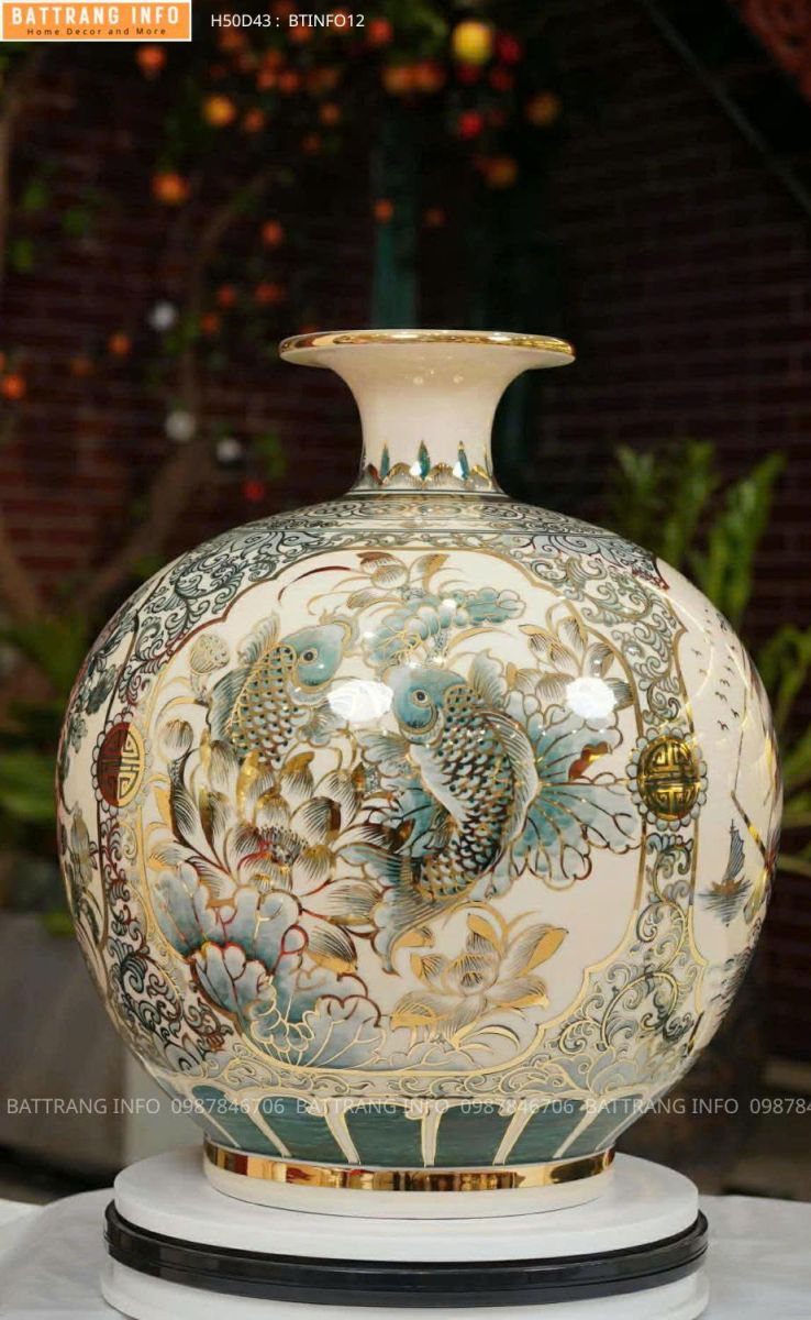 Toàn bộ họa tiết trên bình được nghệ nhân Bát Tràng vẽ tay hoàn toàn, từng nét bút mềm mại, có chiều sâu nghệ thuật. Điểm nhấn là vàng thật 24K được vẽ thủ công, tạo hiệu ứng ánh kim sang trọng, nổi bật, thể hiện đẳng cấp của dòng sản phẩm phong thủy cao cấp.