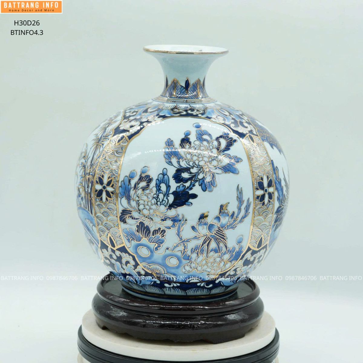 Bình Hút Tài Lộc Tứ Cảnh Men Lam Vẽ Vàng 24K Cao 30cm – Tinh Hoa Gốm Sứ Bát Tràng Cao Cấp