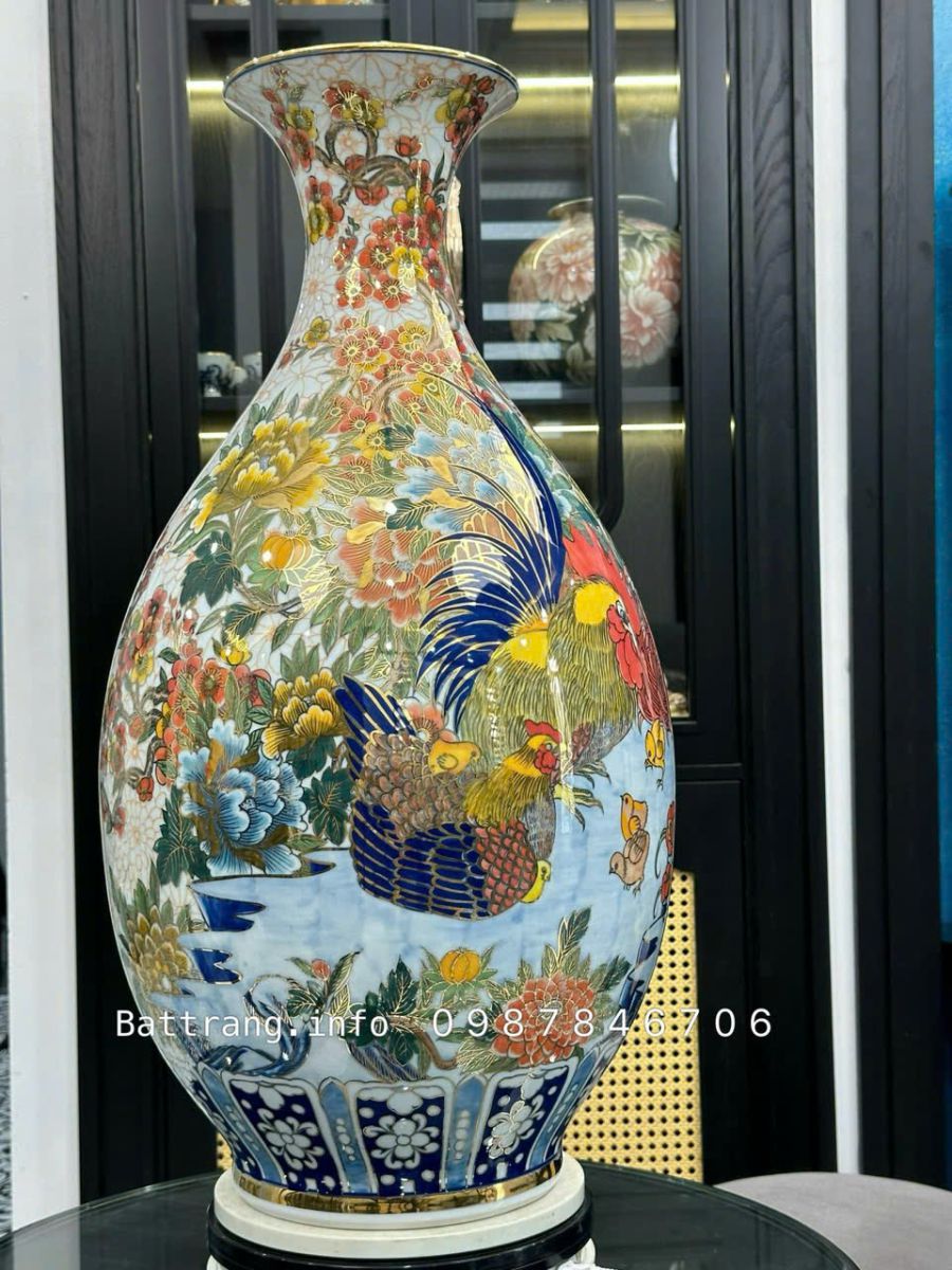 Bình Tỳ Bà Kim Kê Đại Cát cao 70cm vẽ vàng 24K – Gốm sứ Bát Tràng cao cấp
