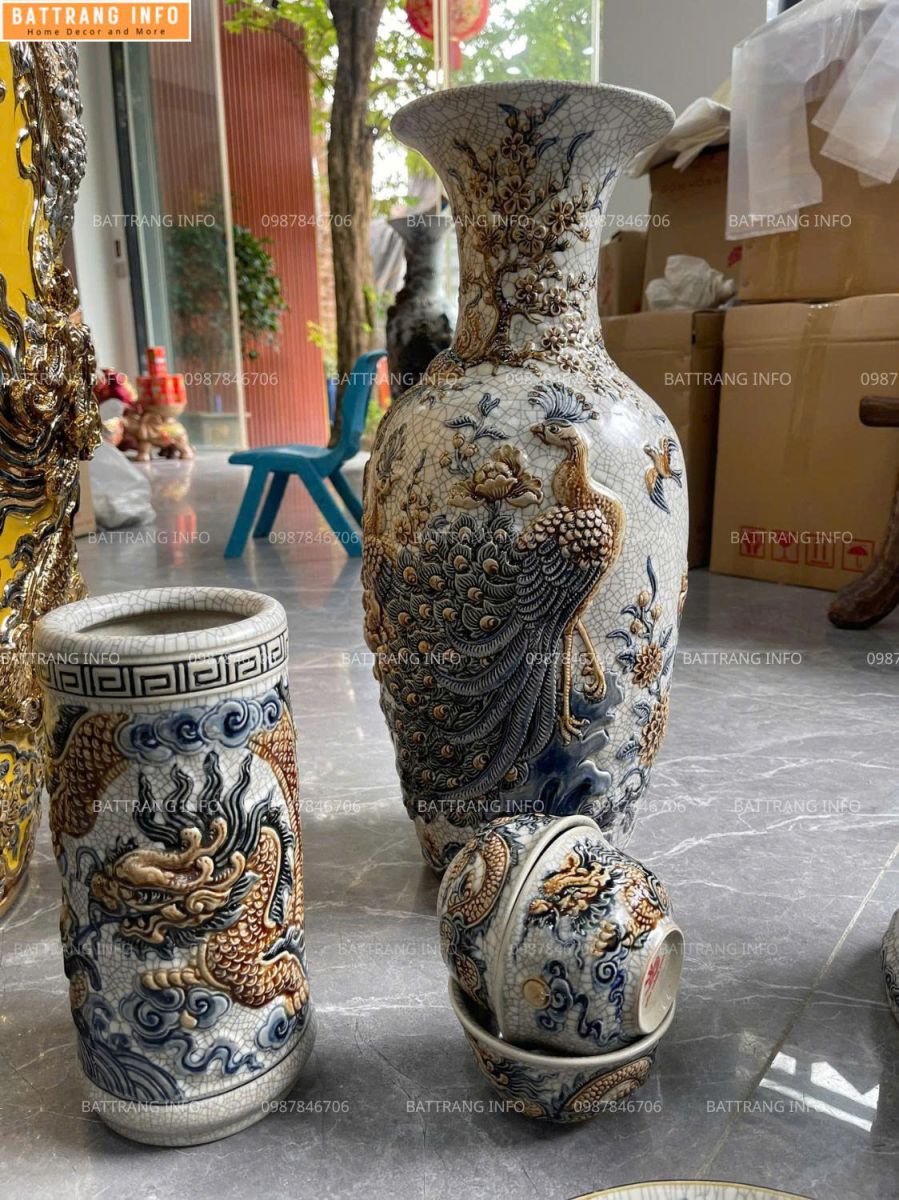 Ban thờ kích thước lớn cần bộ đồ thờ tương xứng. Dòng VIP men rạn đắp nổi giúp không gian thờ trở nên sang trọng, bề thế.