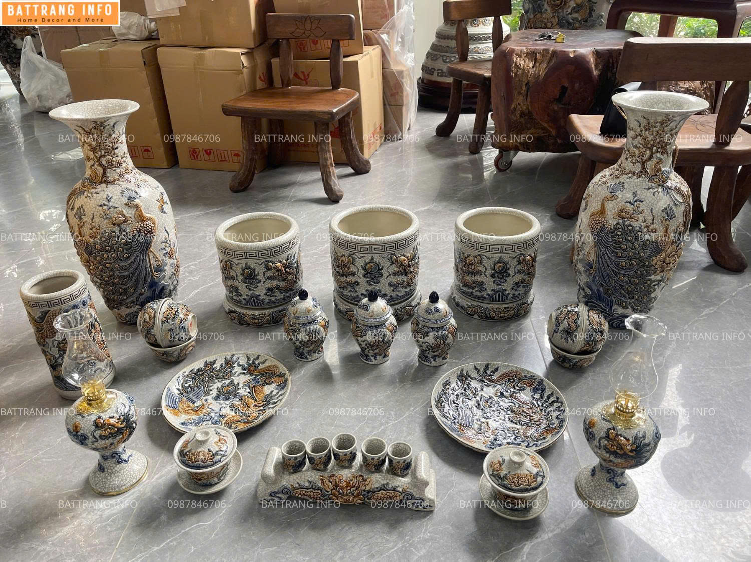 Bộ đồ thờ cơ bản men rạn đắp nổi VIP Bát Tràng cho ban thờ 2m17 – Chuẩn phong thủy, tôn nghiêm và đẳng cấp