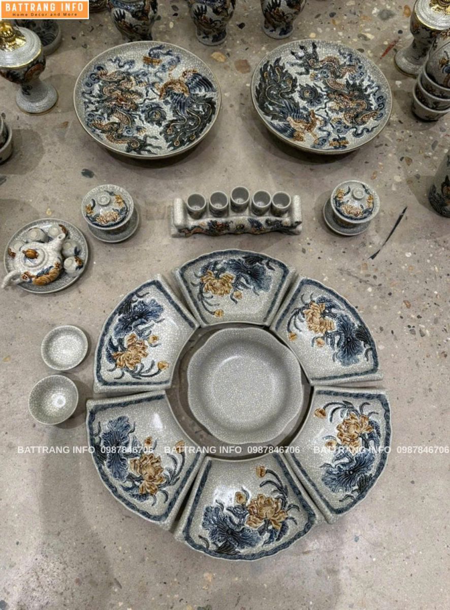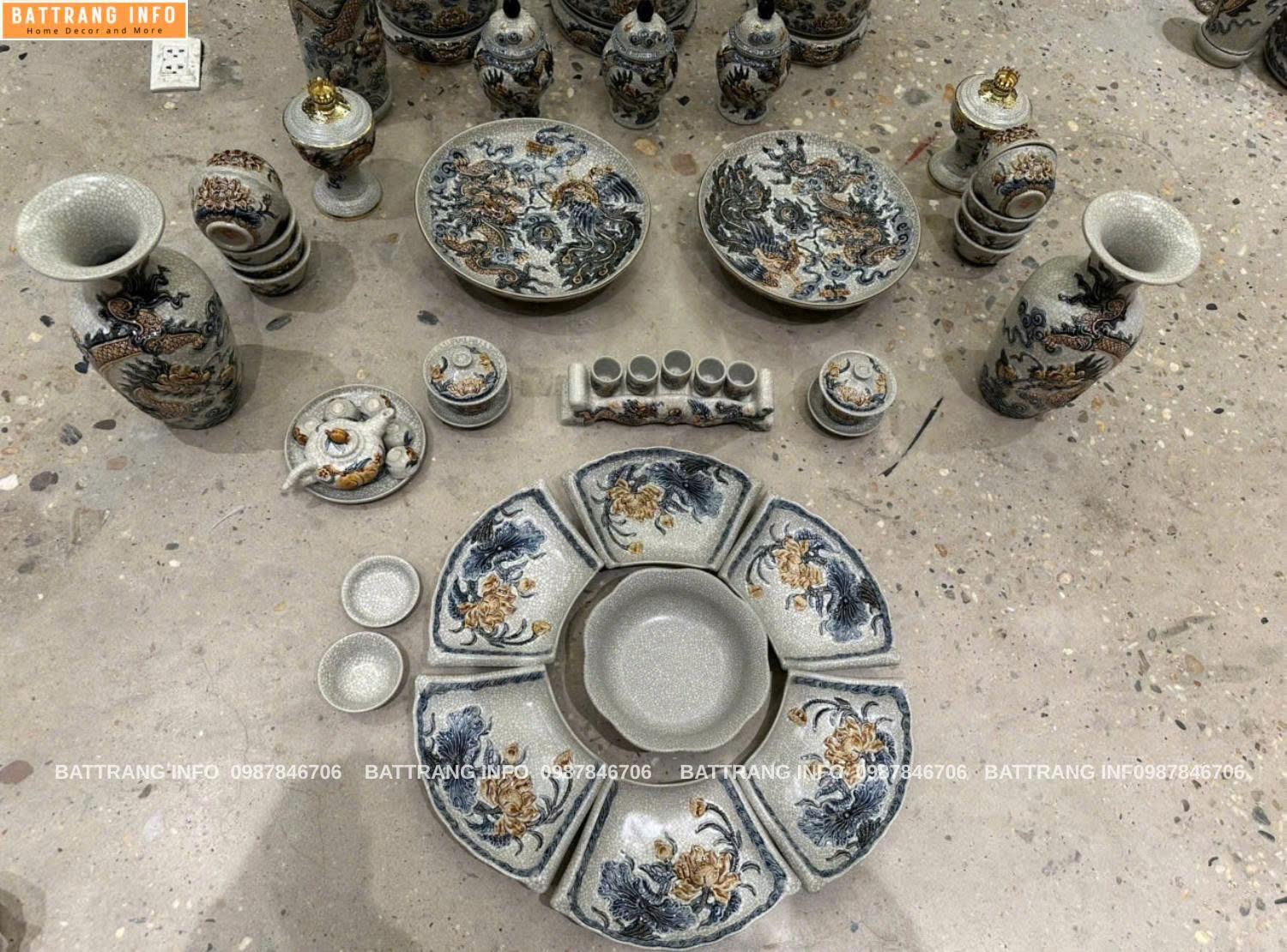 Bộ đồ thờ được chế tác thủ công tại làng gốm Bát Tràng – nơi nổi tiếng hàng trăm năm với nghề gốm sứ. Đặc trưng nổi bật nhất chính là lớp men rạn cổ kính, mang lại vẻ đẹp trầm mặc, uy nghiêm. Cùng với đó là hoa văn đắp nổi tinh xảo, thường là hình rồng, phượng, hoa sen, long quy… biểu tượng cho sự linh thiêng, thịnh vượng và bình an.