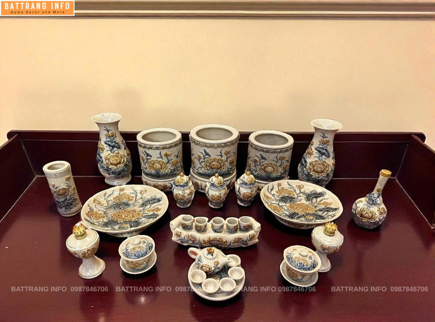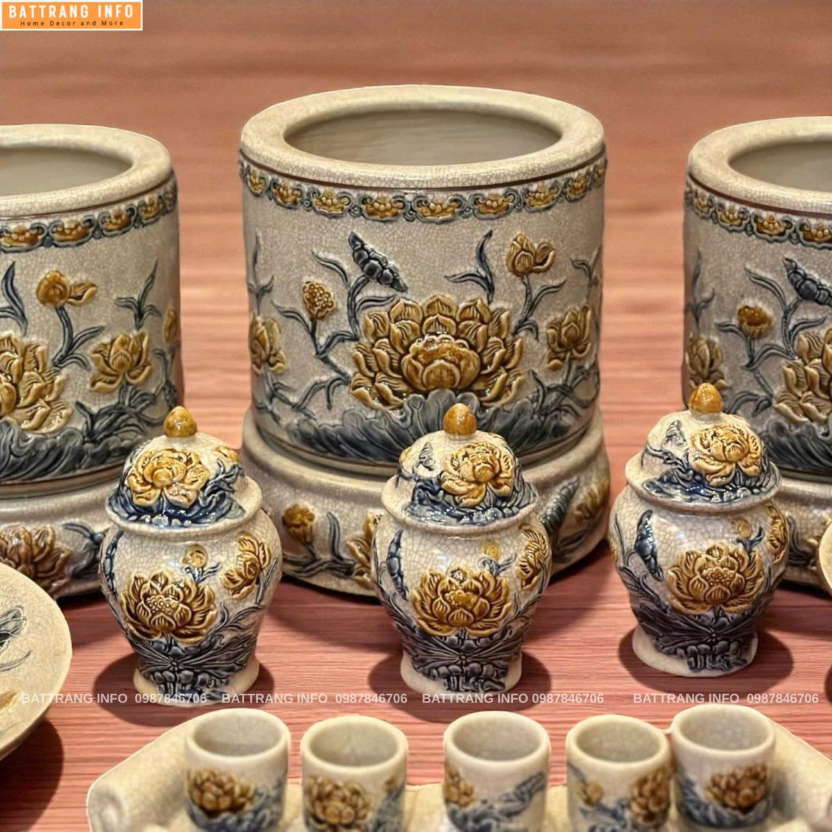 Bộ Đồ Thờ Men Rạn Hoa Sen Đắp Nổi Cao Cấp Bát Tràng Cho Bàn Thờ 1m97