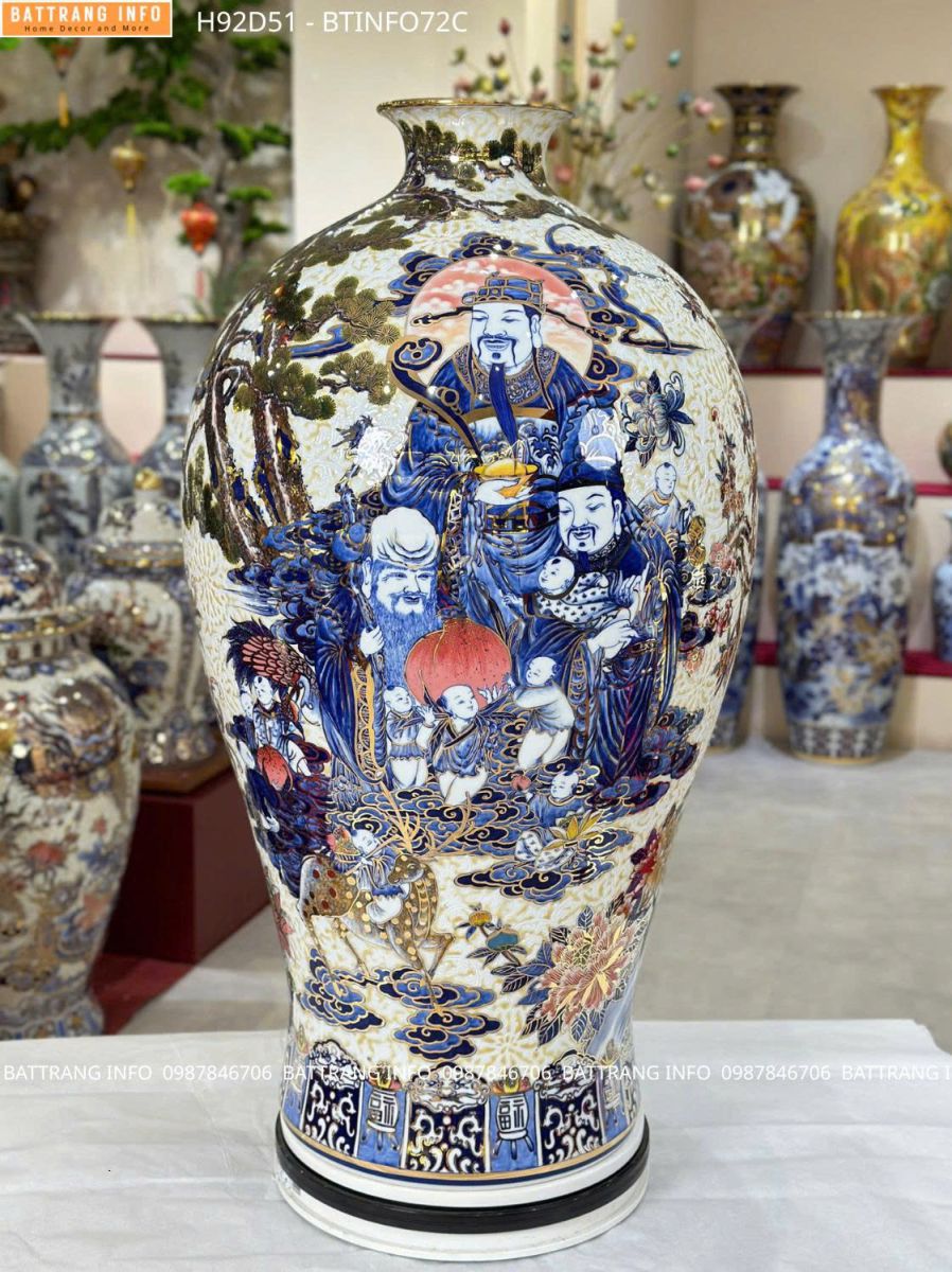 Toàn bộ sản phẩm được chế tác thủ công tinh xảo với men lam truyền thống kết hợp vẽ vàng 24K, tạo nên vẻ đẹp vừa cổ điển, vừa sang trọng, phù hợp với không gian biệt thự, nhà phố cao cấp hoặc phòng thờ trang nghiêm.
