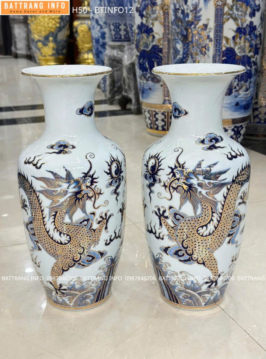 Lọ Hoa Song Long Men Lam Vẽ Vàng 24K Cao 50cm Cao Cấp Bát Tràng – Tinh Hoa Gốm Sứ Việt