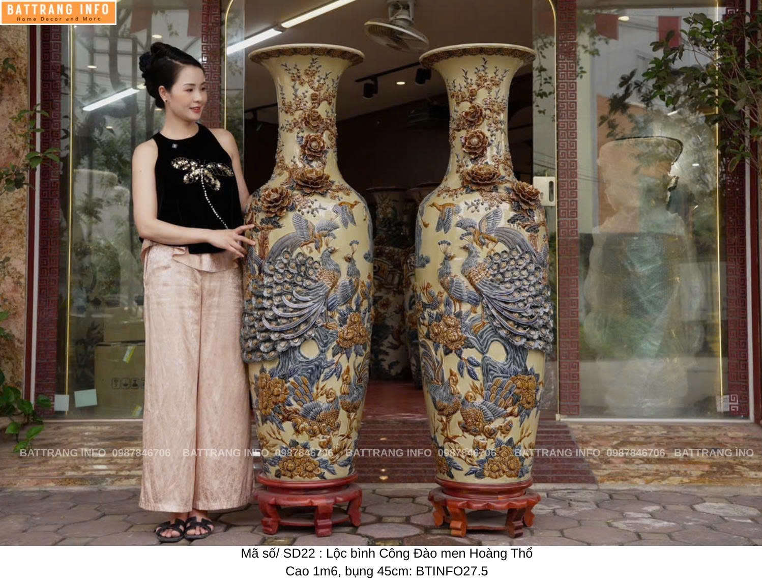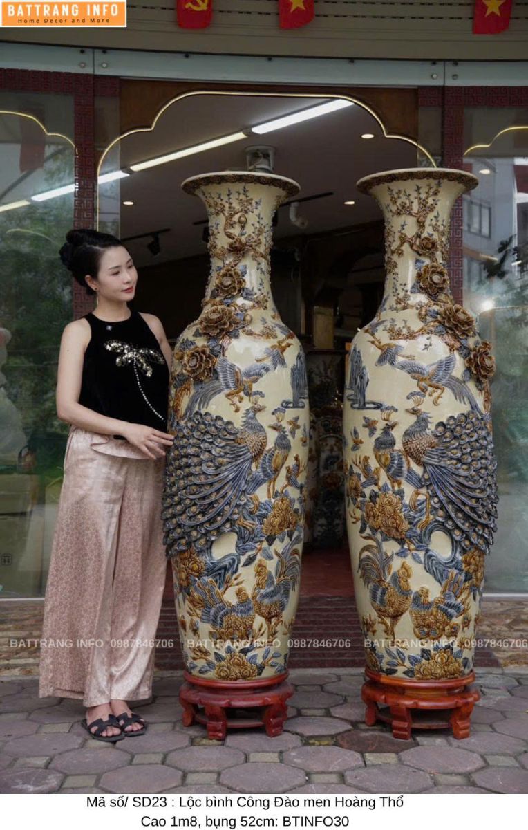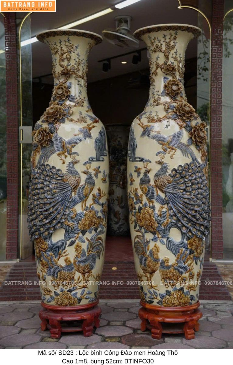 Lộc bình Công Đào men hoàng thổ đắp nổi cao 1m6 & 1m8 là một trong những dòng sản phẩm gốm sứ phong thủy cao cấp của làng nghề Bát Tràng. Sản phẩm không chỉ nổi bật bởi vẻ đẹp tinh xảo, màu men độc đáo mà còn mang nhiều ý nghĩa phong thủy tốt lành, thu hút tài lộc và vượng khí cho gia chủ. Là lựa chọn hoàn hảo để trưng bày phòng khách, sảnh nhà, phòng thờ hoặc làm quà biếu tặng cao cấp, đôi lộc bình này được chế tác hoàn toàn thủ công bởi nghệ nhân gốm lâu năm tại Bát Tràng – nơi lưu giữ tinh hoa gốm sứ Việt.
