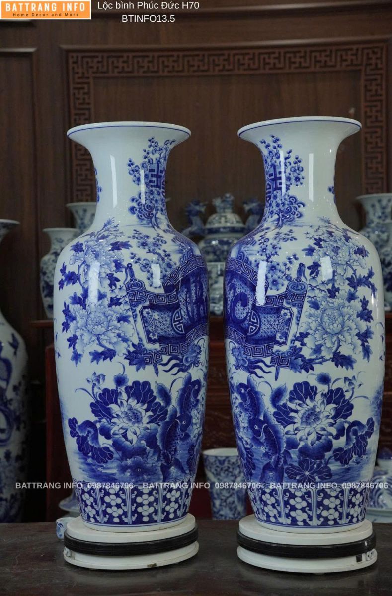 1. Lộc Bình Phúc Đức Men Lam Khử Vẽ Tay cao 70cm là dòng sản phẩm gốm sứ thủ công cao cấp, được chế tác tại làng gốm Bát Tràng nổi tiếng. Với thiết kế truyền thống, họa tiết chữ “Phúc Đức” tượng trưng cho phúc lộc, thịnh vượng và đức độ, sản phẩm không chỉ mang giá trị thẩm mỹ mà còn mang đậm ý nghĩa phong thủy sâu sắc.
