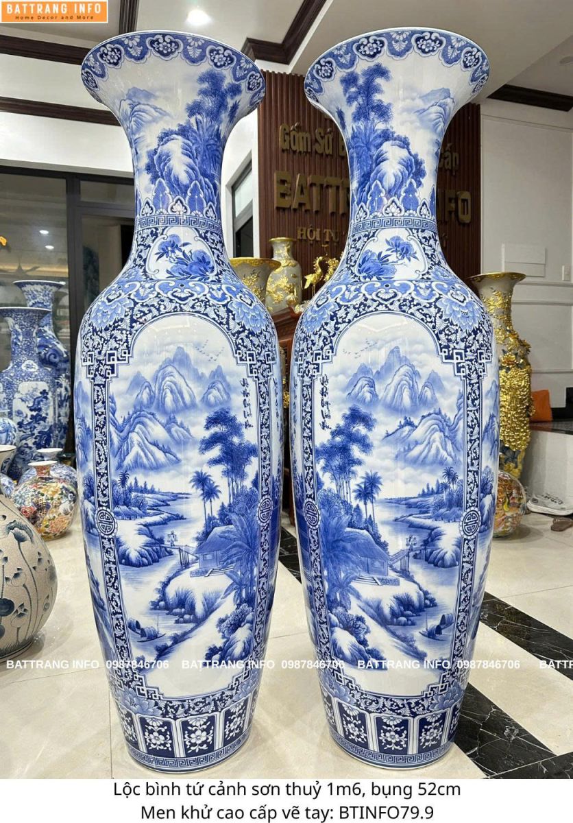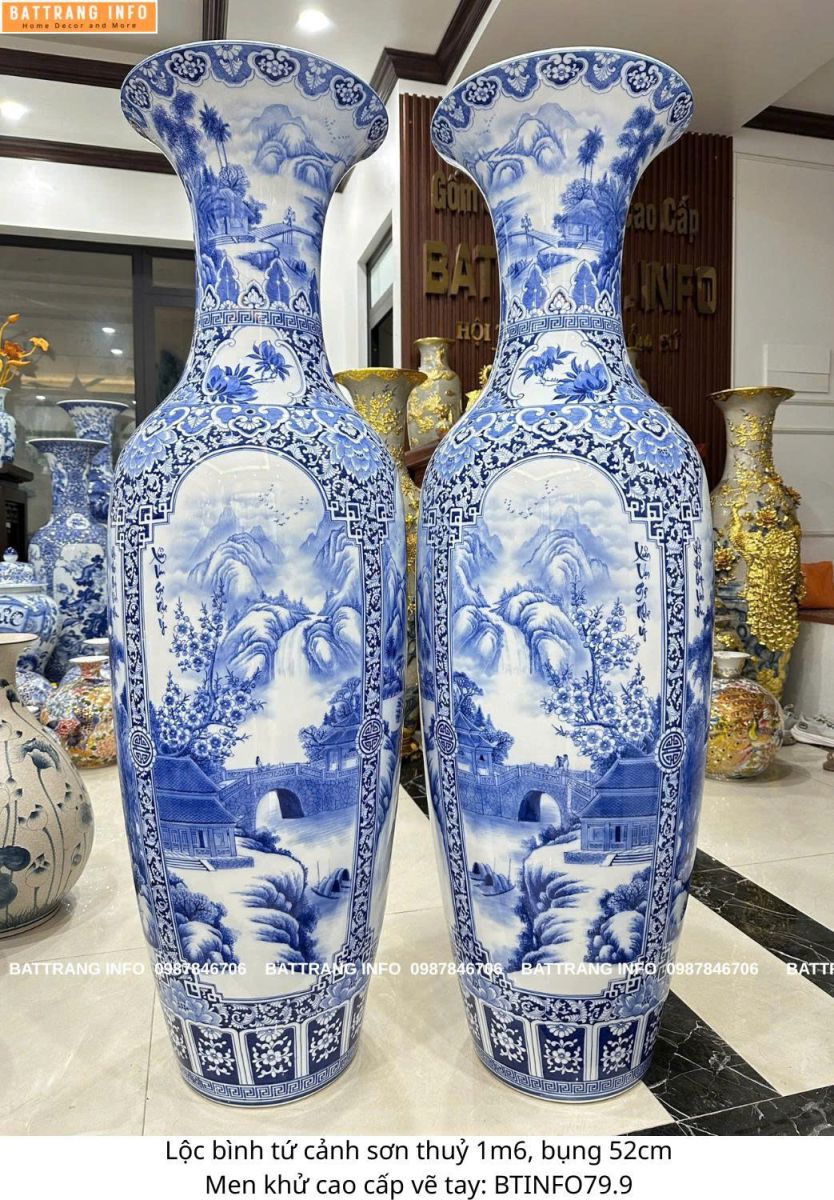 Lộc Bình Tứ Cảnh Sơn Thủy 1m6 Men Lam Vẽ Tay Cao Cấp Bát Tràng – Tài Lộc – Thịnh Vượng – Bình An