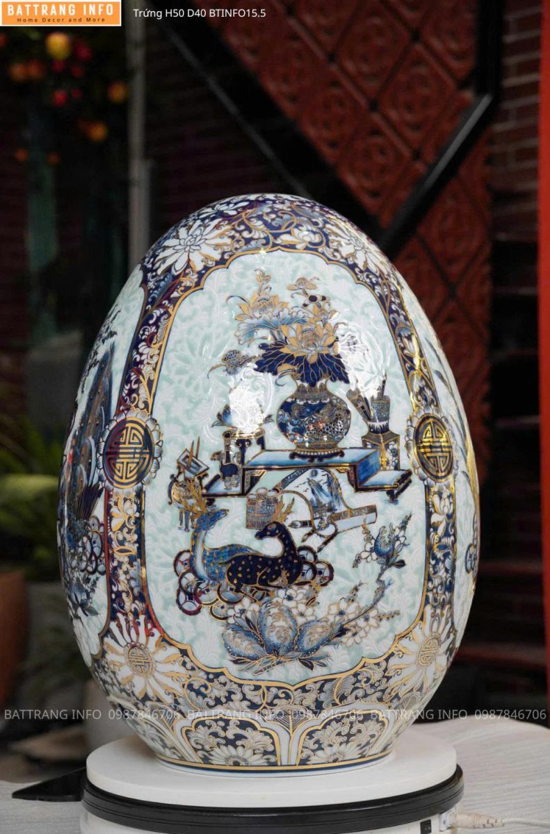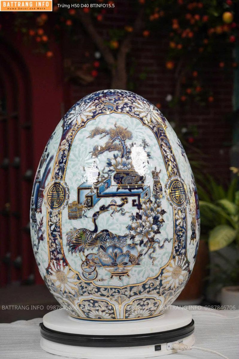 Trứng Phong Thuỷ Tứ Quý Cổ Đồ Men Lam Nền Gấm Vẽ Vàng 24K Cao 50cm – Tuyệt Tác Gốm Sứ Bát Tràng Cao Cấp