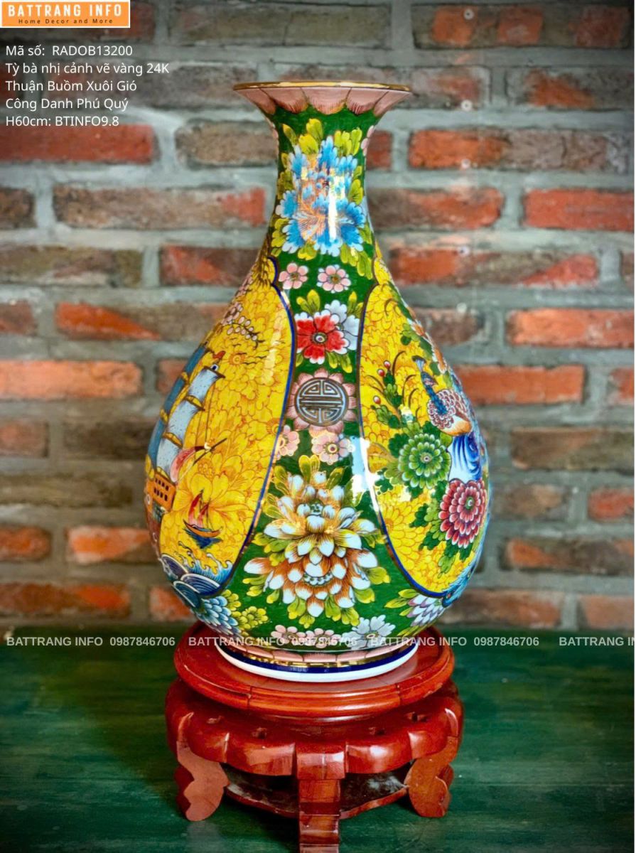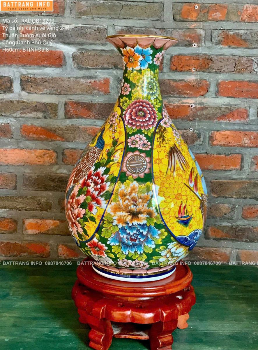 Tỳ Bà Nhị Cảnh vẽ vàng 24k là một trong những dòng sản phẩm cao cấp nhất của làng nghề gốm sứ Bát Tràng. Tác phẩm kết hợp hai cảnh phong thủy nổi tiếng: • Thuận Buồm Xuôi Gió – tượng trưng cho hanh thông, may mắn, làm ăn phát đạt. • Công Danh Phú Quý – biểu tượng cho tài lộc, thăng tiến, vinh hoa bền vững. Chiều cao 60cm, thân tỳ bà dáng sang trọng, họa tiết vẽ tay tỉ mỉ, phủ vàng kim 24K, mang ý nghĩa thu hút tài lộc – trấn trạch – chiêu vượng khí.