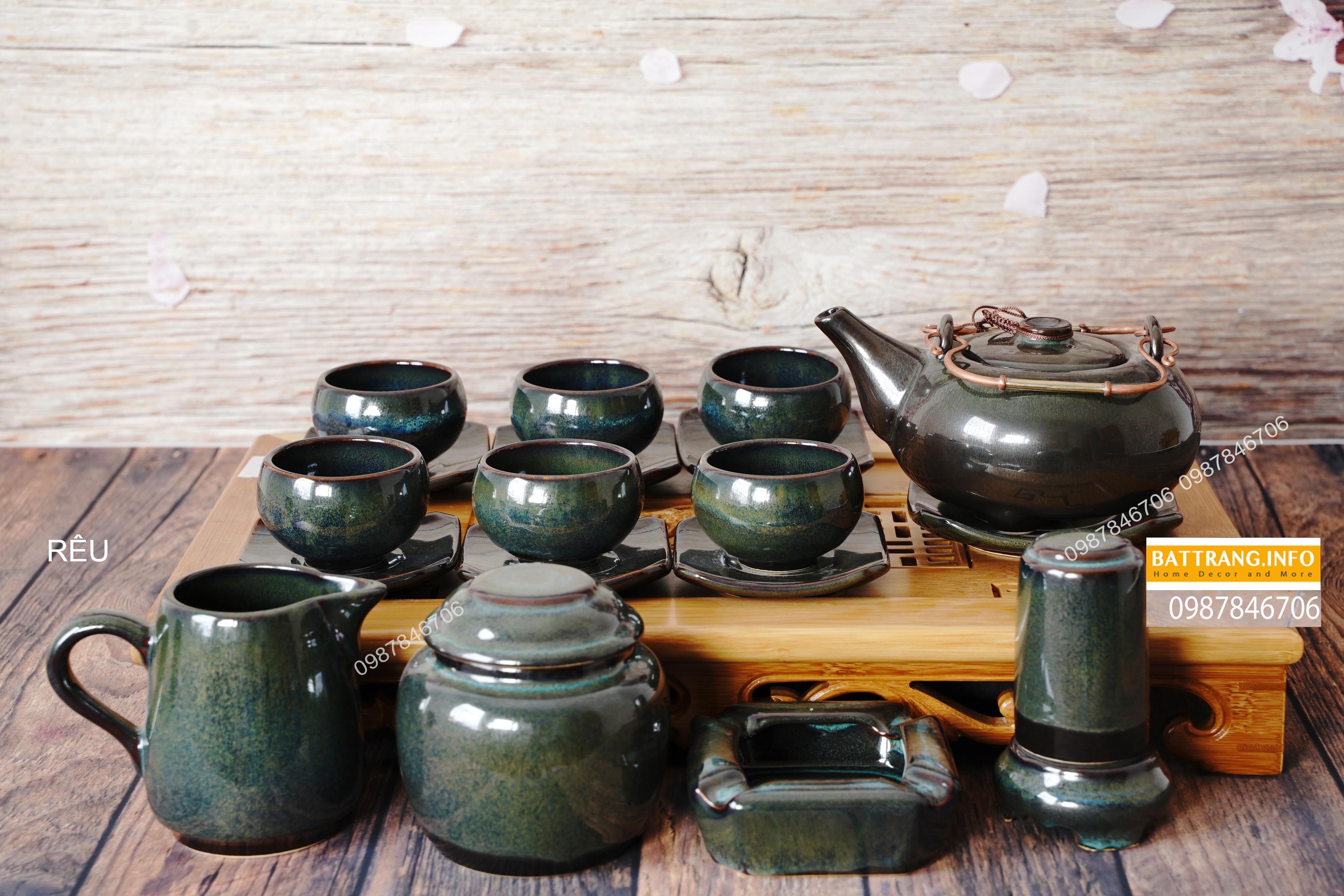 Ấm chén quai đồng men rêu biến Bát Tràng - ấm chén quà tặng sang trọng