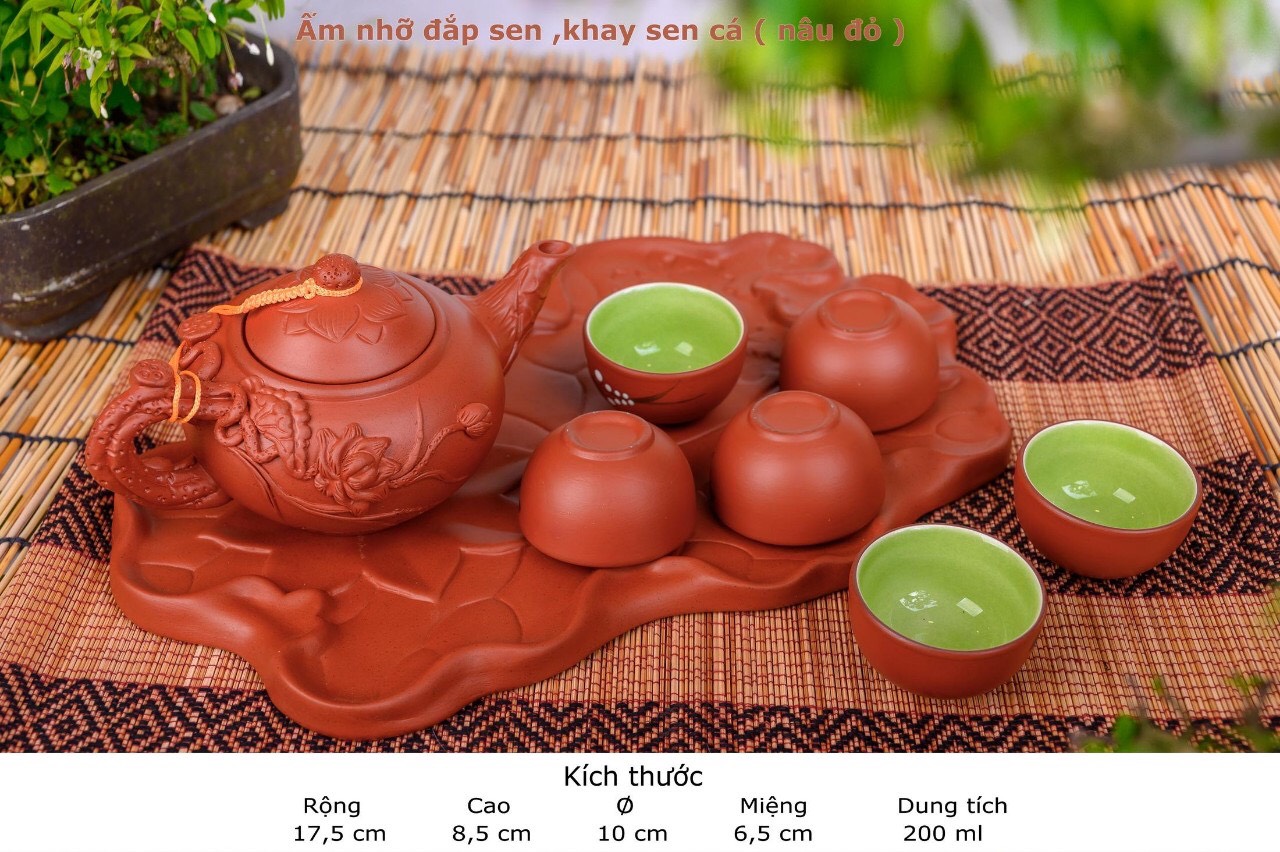 Bộ ấm chén tử sa khay lá sen đắp nhỡ nâu đỏ