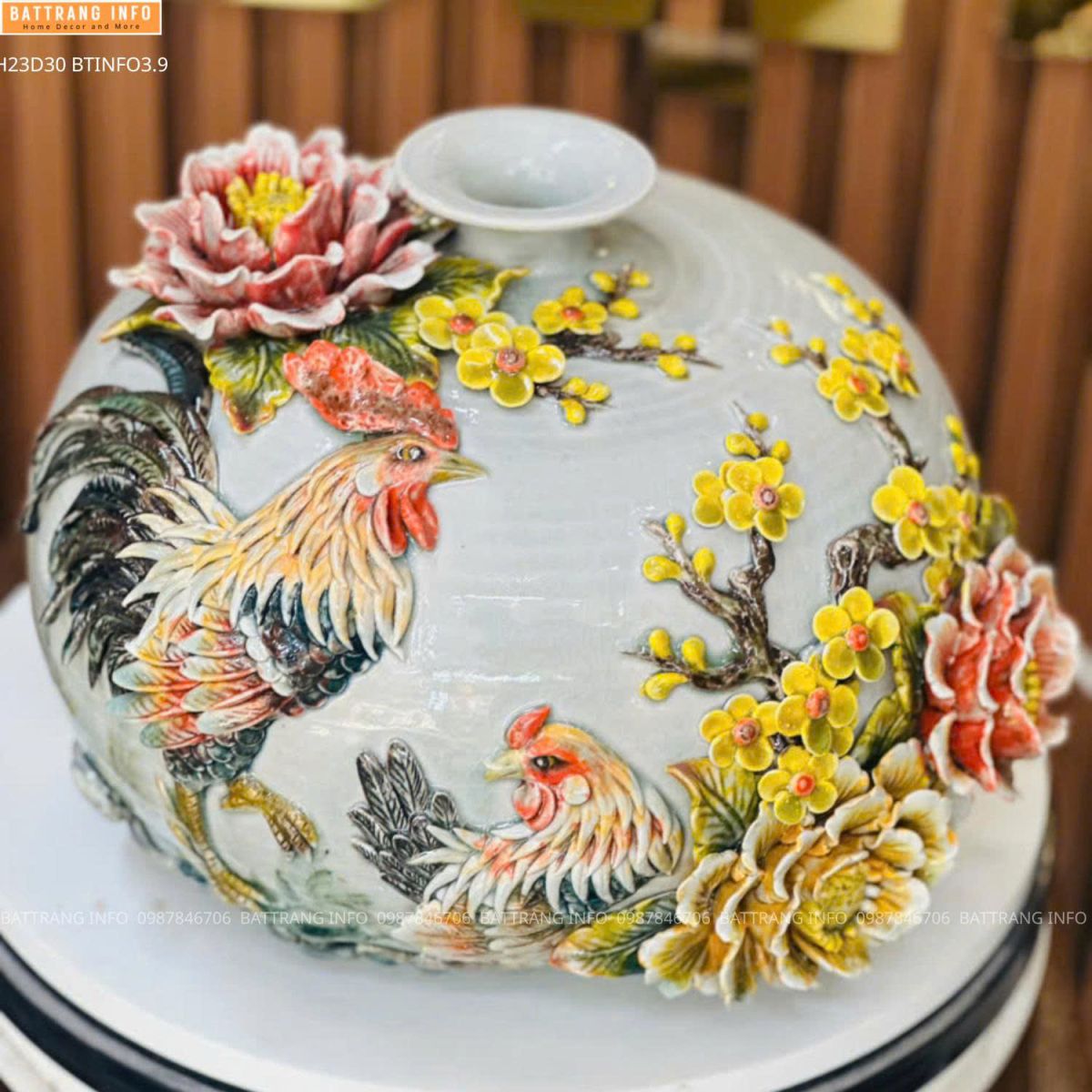 Bình hút lộc Kim Kê đắp nổi cao cấp Bát Tràng cao 23cm – Vật phẩm phong thủy chiêu tài, vượng lộc