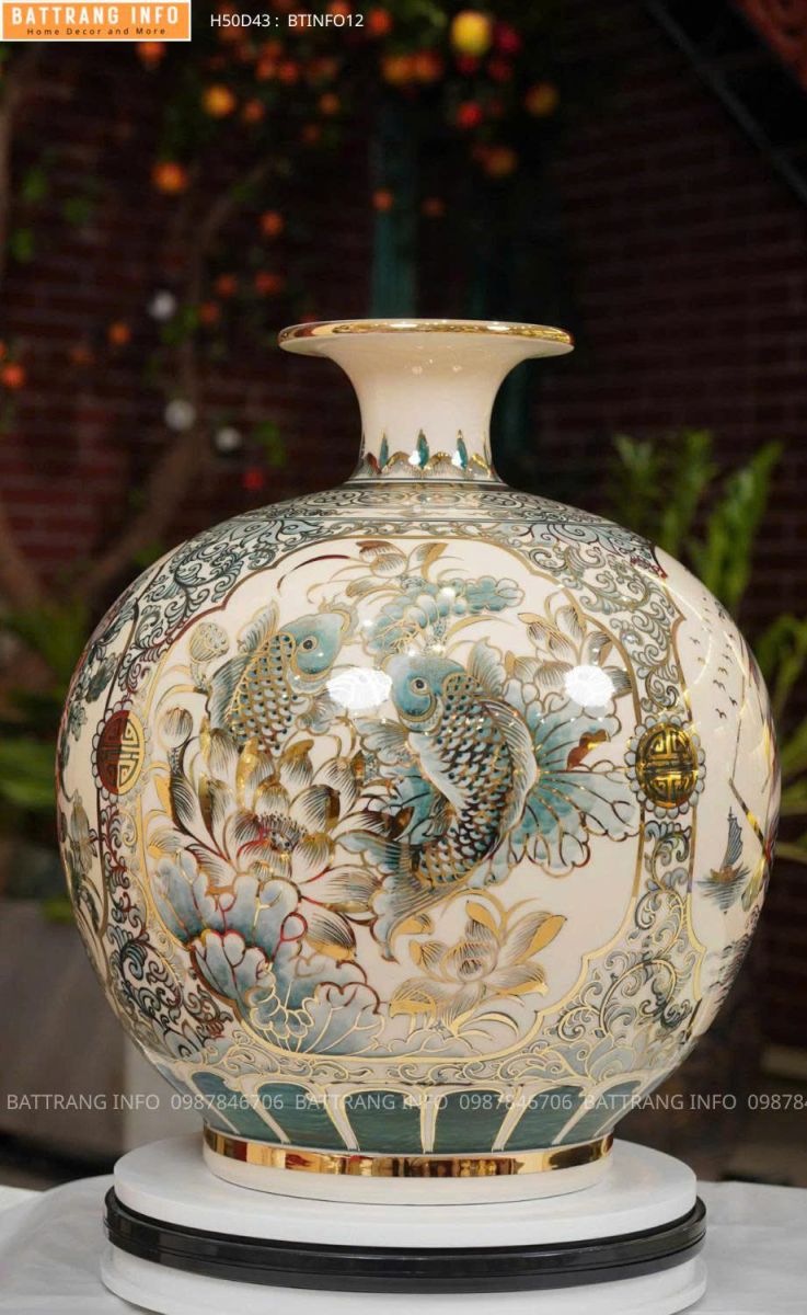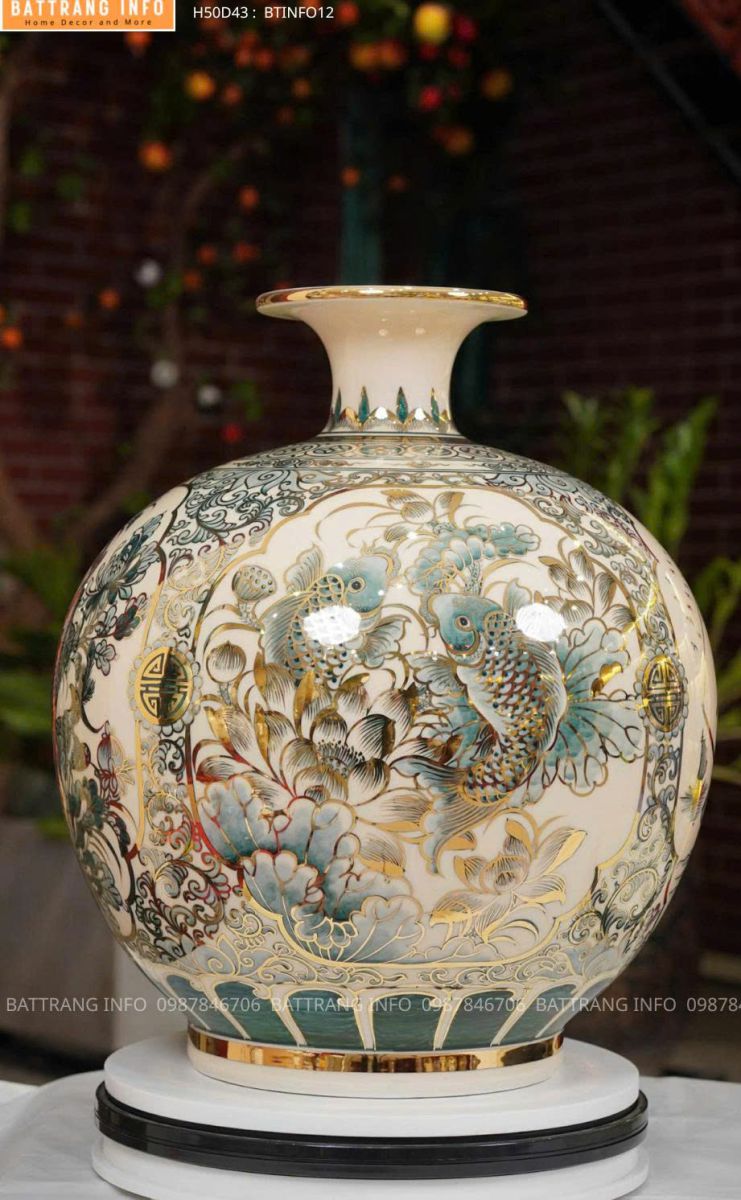 Toàn bộ họa tiết trên bình được nghệ nhân Bát Tràng vẽ tay hoàn toàn, từng nét bút mềm mại, có chiều sâu nghệ thuật. Điểm nhấn là vàng thật 24K được vẽ thủ công, tạo hiệu ứng ánh kim sang trọng, nổi bật, thể hiện đẳng cấp của dòng sản phẩm phong thủy cao cấp.