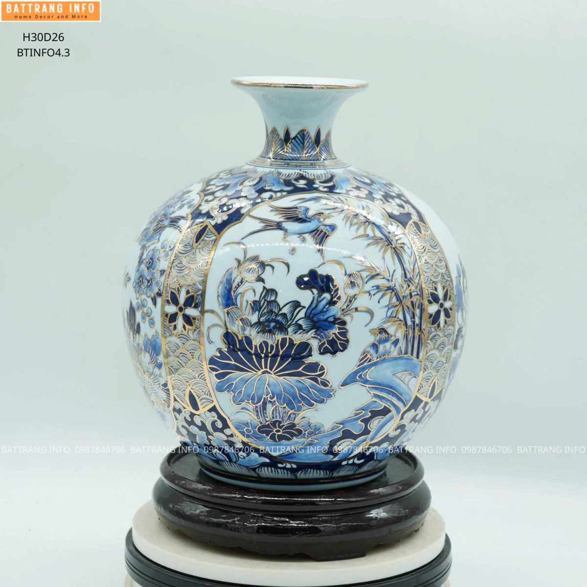 Bình Hút Tài Lộc Tứ Cảnh Men Lam Vẽ Vàng 24K Cao 30cm – Tinh Hoa Gốm Sứ Bát Tràng Cao Cấp