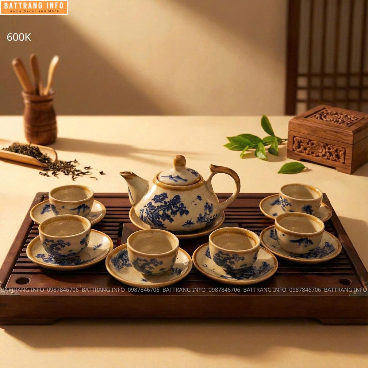 Bộ Ấm Chén Men Rạn Vẽ Giả Cổ Cao Cấp Bát Tràng – Tinh Hoa Gốm Việt Dành Cho Gia Chủ Sành Trà