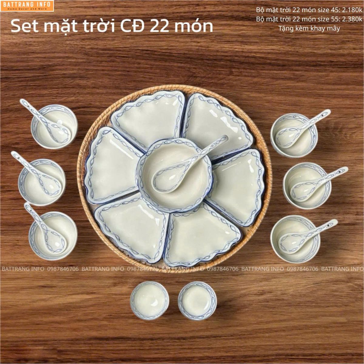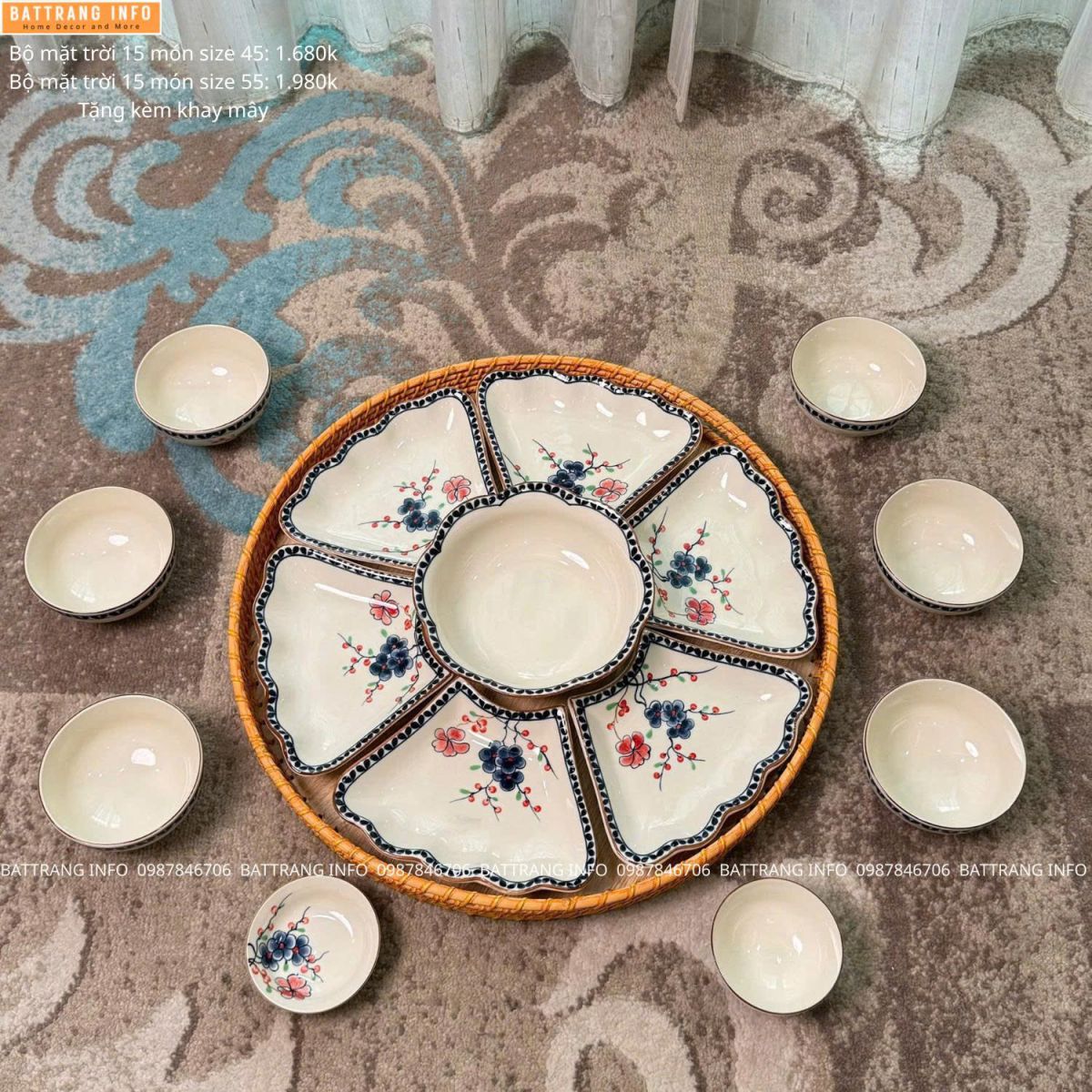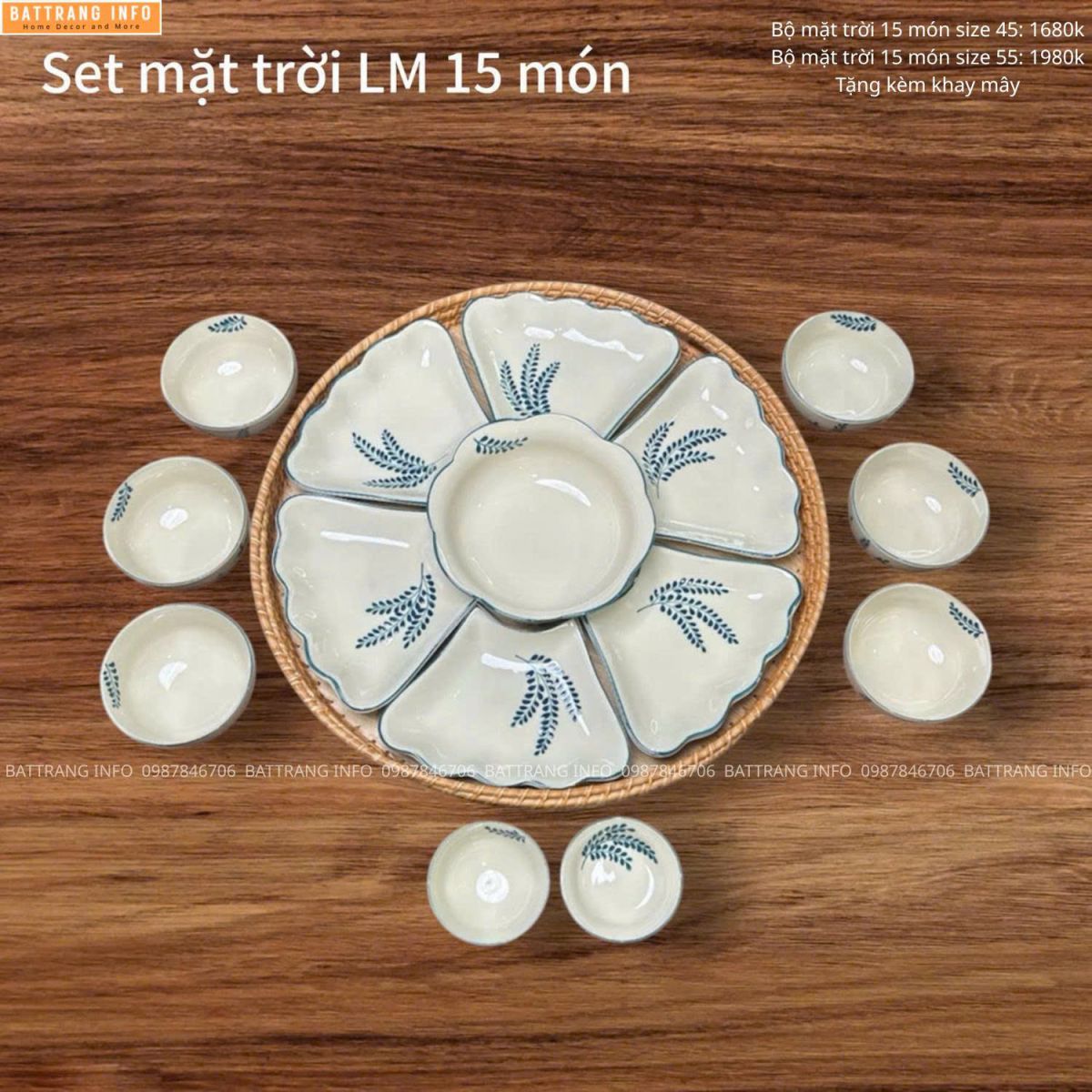 Bộ bát đĩa hoa mặt trời vẽ tay cao cấp Bát Tràng thường bao gồm đầy đủ:
