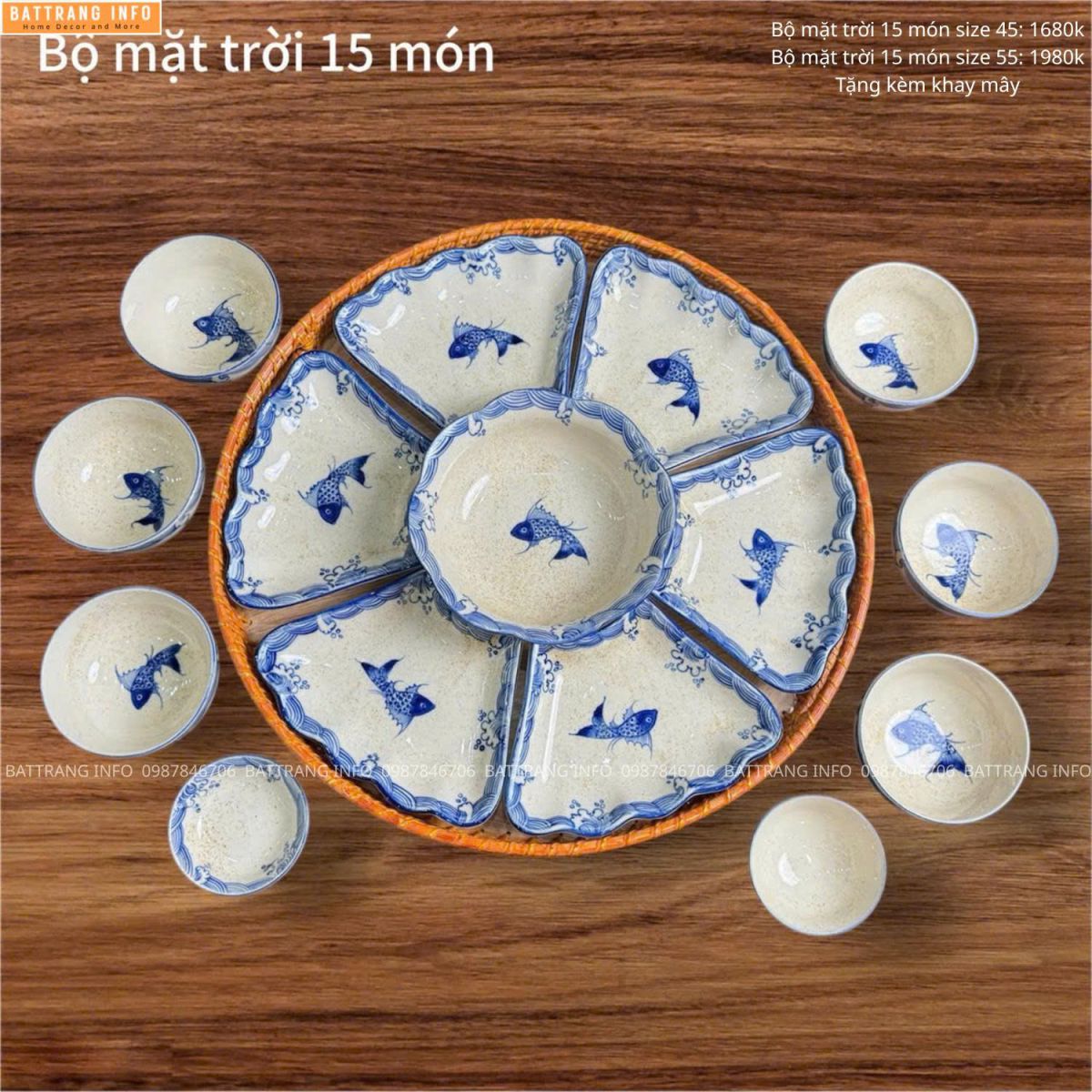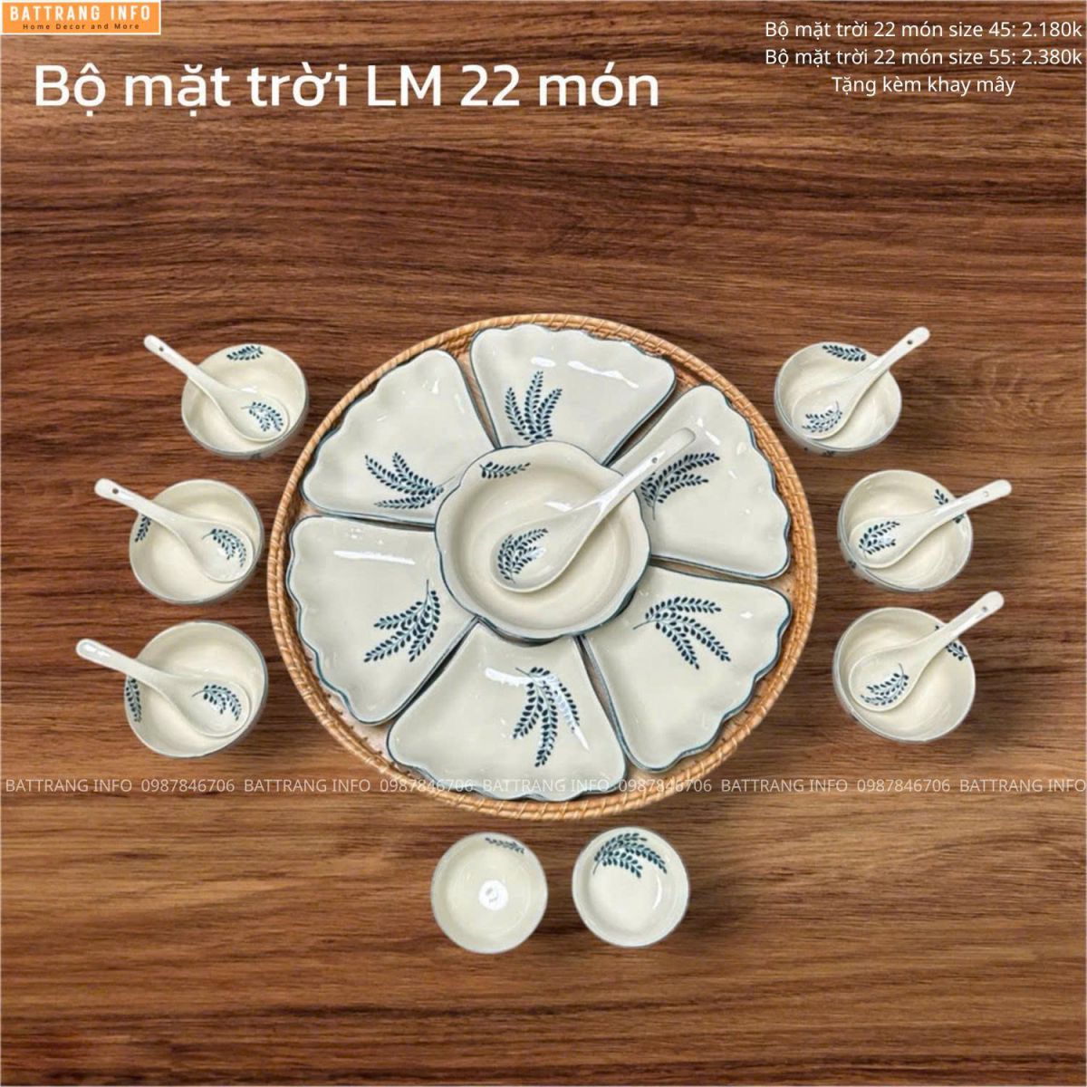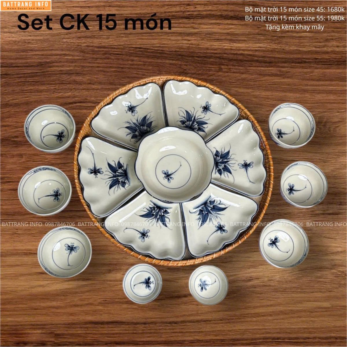 Bộ bát đĩa hoa mặt trời vẽ tay cao cấp Bát Tràng thường bao gồm đầy đủ: