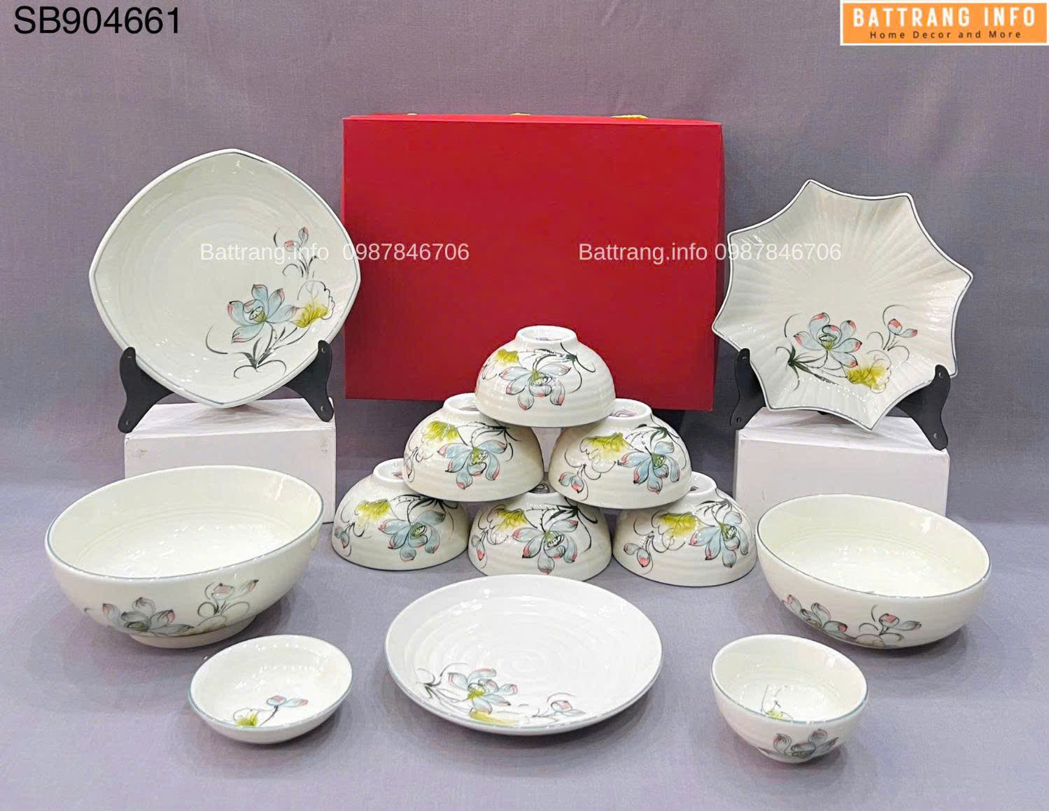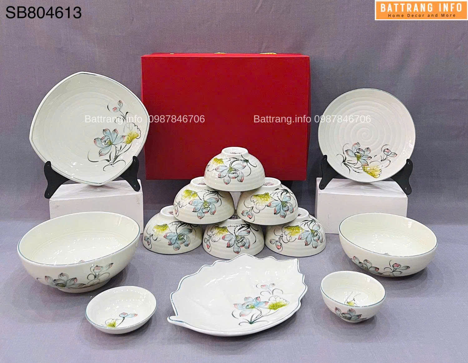 Một bộ bát đĩa sen cốm men kem vẽ tay cao cấp Bát Tràng thường bao gồm:
