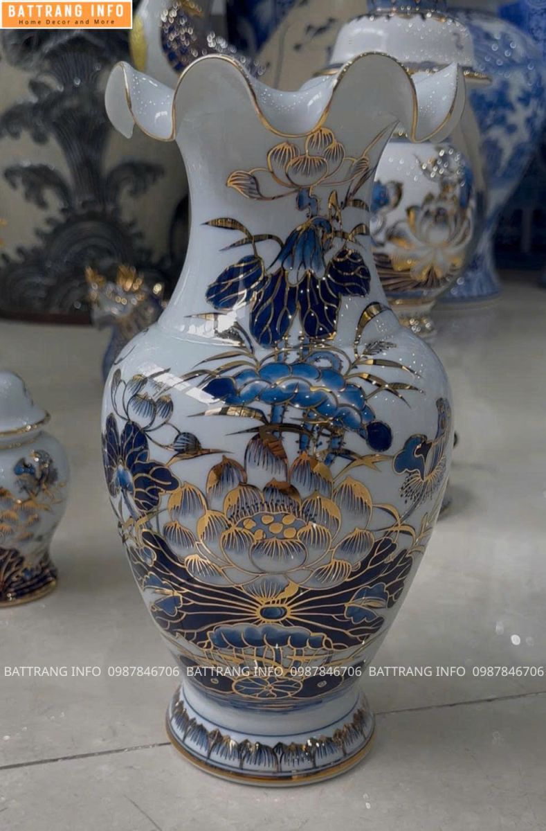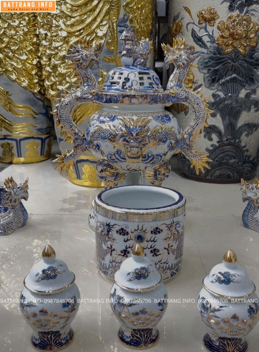 Bộ đồ thờ Thần Linh men lam vẽ vàng 24K cao cấp Bát Tràng cho ban thờ 1m75 – Chuẩn phong thủy, nâng tầm không gian thờ cúng