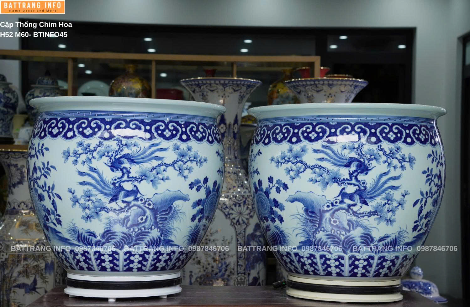 Cặp Thống Chim Hoa men lam xanh vẽ tay cao 52cm là sản phẩm gốm sứ cao cấp đến từ làng gốm Bát Tràng – cái nôi của nghệ thuật gốm sứ truyền thống Việt Nam. Với chiều cao lý tưởng 52cm, dòng sản phẩm này không chỉ mang giá trị thẩm mỹ mà còn ẩn chứa nhiều ý nghĩa phong thủy, rất thích hợp trưng bày trong không gian phòng khách, phòng thờ, sảnh lớn hoặc làm quà biếu sang trọng.
