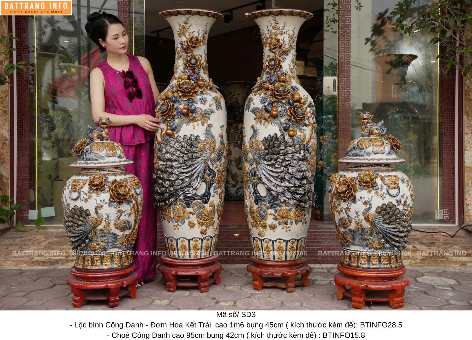 Combo Lộc Bình Công Danh Phú Quý men rạn đắp nổi cao 1m6 và Chóe Công Danh cao 95cm là bộ sản phẩm gốm sứ cao cấp, được chế tác thủ công hoàn toàn tại làng gốm Bát Tràng – nơi lưu giữ tinh hoa gốm sứ truyền thống Việt Nam. Bộ đôi này không chỉ là vật phẩm trang trí sang trọng mà còn mang giá trị phong thủy sâu sắc, giúp thu hút tài lộc, công danh, thịnh vượng và sự bình an cho gia chủ.