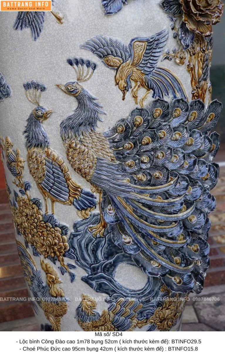 • Kích thước cao 1,78m – thuộc dòng lộc bình “khủng” trong các dòng gốm trang trí cao cấp • Thân bình được đắp nổi họa tiết Chim Công & Hoa Đào – biểu tượng cho quyền uy, phú quý, sinh khí và sự thanh thoát