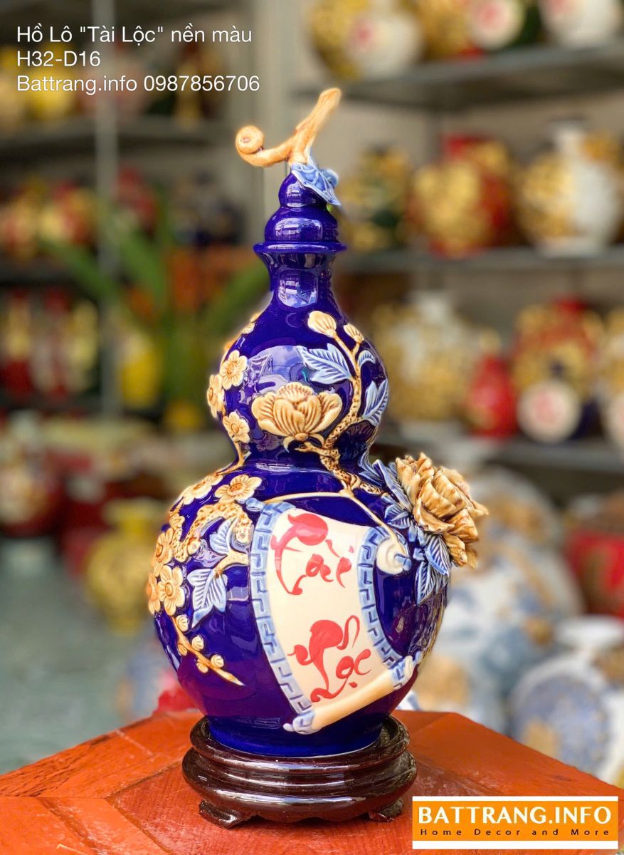 Hồ lô tài lộc men màu đắp nổi cao 32cm là một trong những dòng sản phẩm gốm sứ phong thủy cao cấp của làng nghề Bát Tràng. Được chế tác thủ công tỉ mỉ bởi các nghệ nhân lành nghề, sản phẩm mang trong mình vẻ đẹp tinh tế, sang trọng và đậm đà giá trị văn hóa truyền thống Việt Nam. Hồ lô được phủ men màu cao cấp, kết hợp họa tiết đắp nổi tinh xảo, tạo nên một tổng thể hài hòa và bắt mắt. Với chiều cao 32cm, đây là kích thước lý tưởng để trưng bày trên bàn thờ Thần Tài, kệ phong thủy, hoặc trong phòng khách, giúp thu hút tài lộc, bình an và may mắn cho gia chủ.