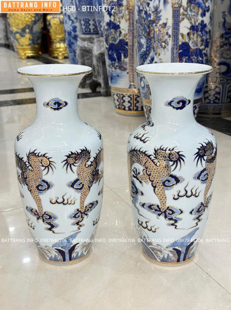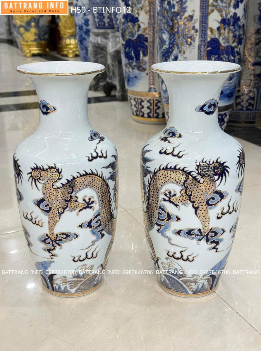Lọ Hoa Song Long Men Lam Vẽ Vàng 24K Cao 50cm Cao Cấp Bát Tràng – Tinh Hoa Gốm Sứ Việt