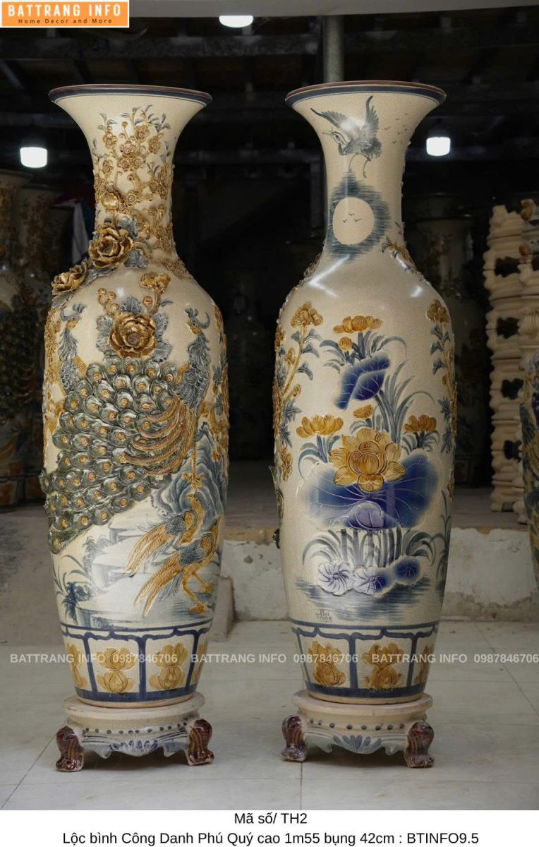 Lộc Bình Công Danh Phú Quý Men Rạn Đắp Nổi Cao 1m55 Bụng 42cm – Đỉnh Cao Nghệ Thuật Gốm Bát Tràng