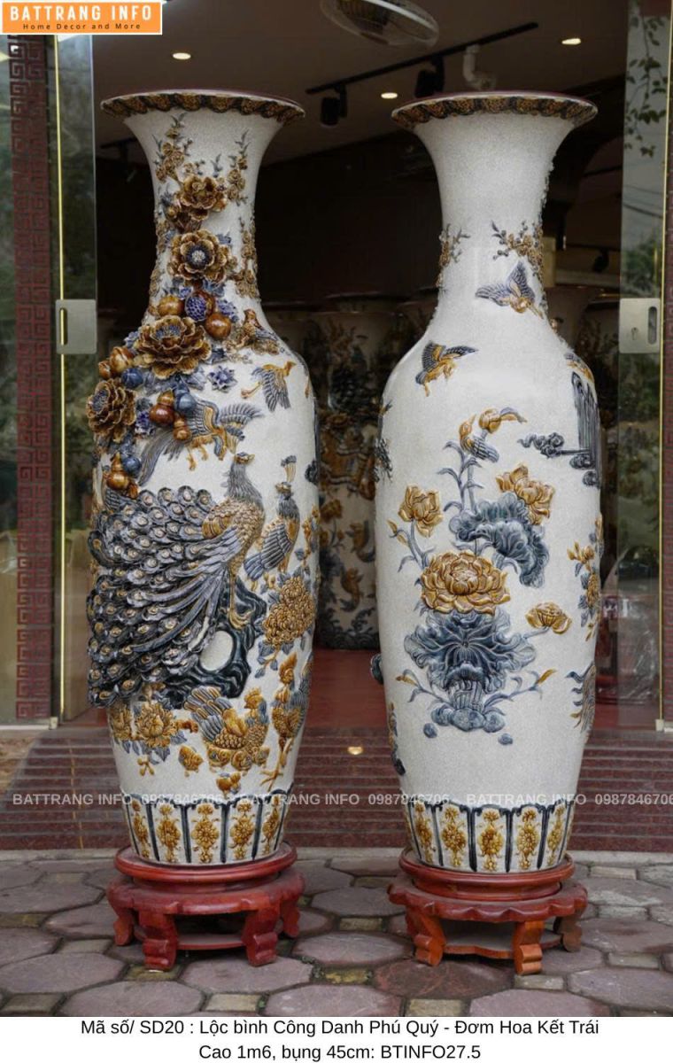 Lộc bình Công Danh Phú Quý men rạn đắp nổi cao 1m6, bụng 45cm là sản phẩm gốm sứ cao cấp Bát Tràng, được chế tác thủ công tinh xảo bởi những nghệ nhân lành nghề. Với họa tiết đắp nổi sống động, nước men rạn cổ đặc trưng và kiểu dáng truyền thống, sản phẩm không chỉ là vật phẩm trang trí sang trọng mà còn mang ý nghĩa phong thủy vô cùng sâu sắc.