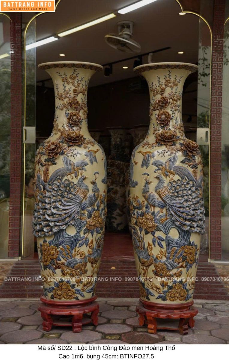 Lộc bình Công Đào men hoàng thổ đắp nổi cao 1m6 & 1m8 là một trong những dòng sản phẩm gốm sứ phong thủy cao cấp của làng nghề Bát Tràng. Sản phẩm không chỉ nổi bật bởi vẻ đẹp tinh xảo, màu men độc đáo mà còn mang nhiều ý nghĩa phong thủy tốt lành, thu hút tài lộc và vượng khí cho gia chủ. Là lựa chọn hoàn hảo để trưng bày phòng khách, sảnh nhà, phòng thờ hoặc làm quà biếu tặng cao cấp, đôi lộc bình này được chế tác hoàn toàn thủ công bởi nghệ nhân gốm lâu năm tại Bát Tràng – nơi lưu giữ tinh hoa gốm sứ Việt.