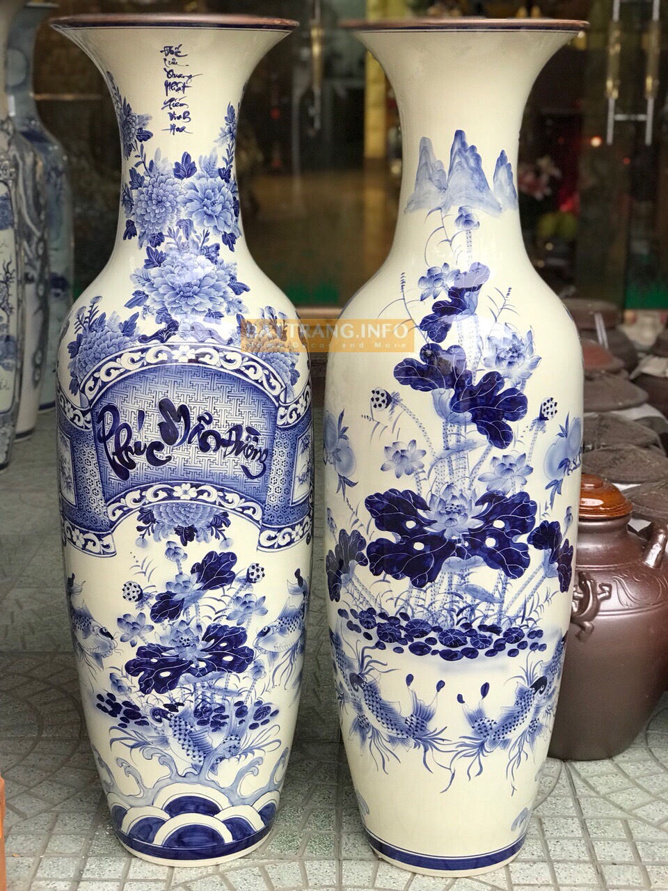 Lộc bình " Phúc Mãn Đường" vẽ kĩ men lam trắng Bát Tràng cao 1m4
