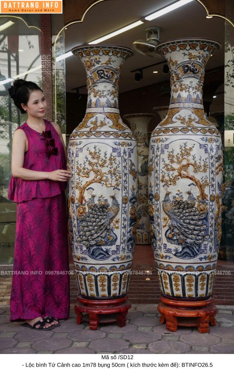 Lộc bình Tứ Cảnh men rạn đắp nổi cao 1m78 bụng 50cm là tuyệt tác gốm sứ thủ công đến từ làng nghề Bát Tràng – nơi lưu giữ tinh hoa văn hóa gốm Việt. Sản phẩm không chỉ là vật phẩm trang trí phong thủy cao cấp mà còn mang ý nghĩa tâm linh sâu sắc, thường được sử dụng trong không gian thờ cúng, phòng khách hoặc đại sảnh.