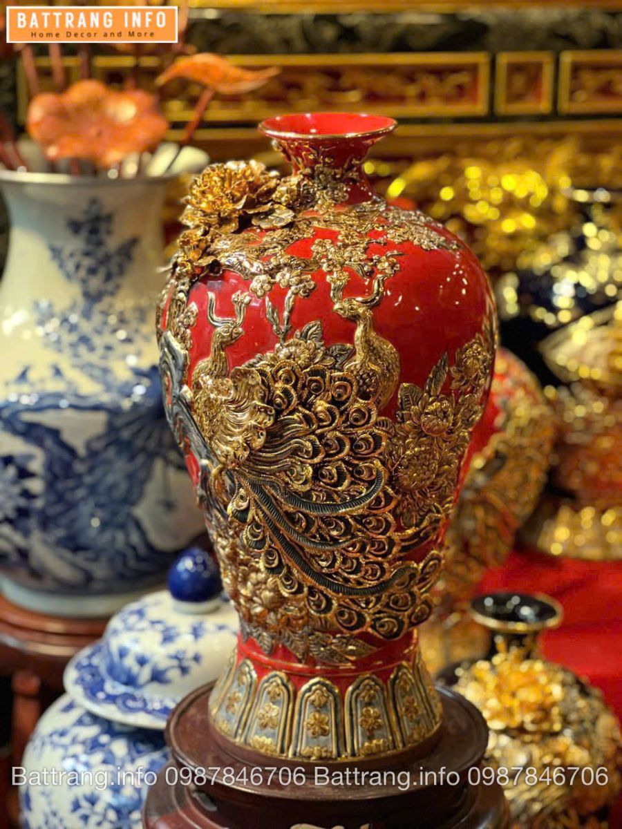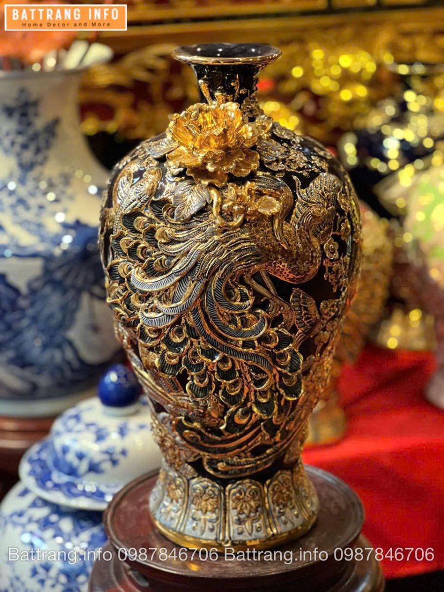 Mai bình Công Danh Phú Quý men màu đắp nổi vẽ vàng 24k là một trong những dòng sản phẩm gốm sứ cao cấp nhất của làng nghề Bát Tràng. Chiếc bình hội tụ đầy đủ giá trị thẩm mỹ – phong thủy – nghệ thuật thủ công với kỹ thuật đắp nổi tinh xảo và họa tiết vẽ vàng 24k sang trọng. Đây là lựa chọn lý tưởng để trưng bày phòng khách, phòng làm việc, biệt thự, hoặc sử dụng như quà tặng cao cấp dành cho đối tác, doanh nghiệp, tân gia, khai trương.