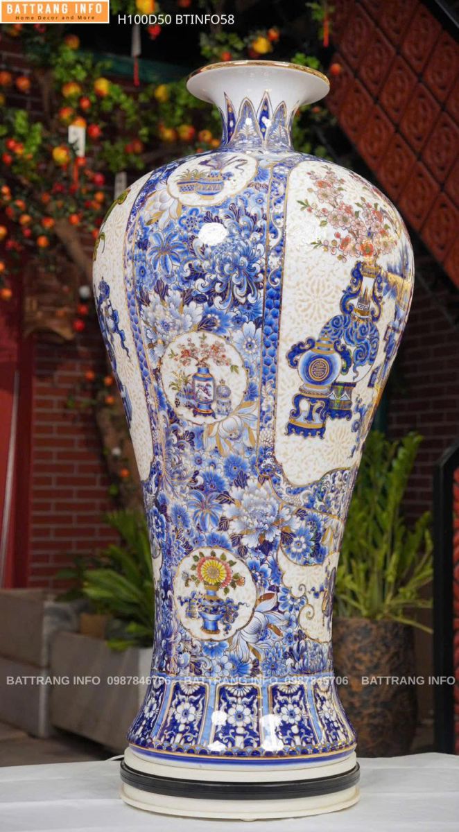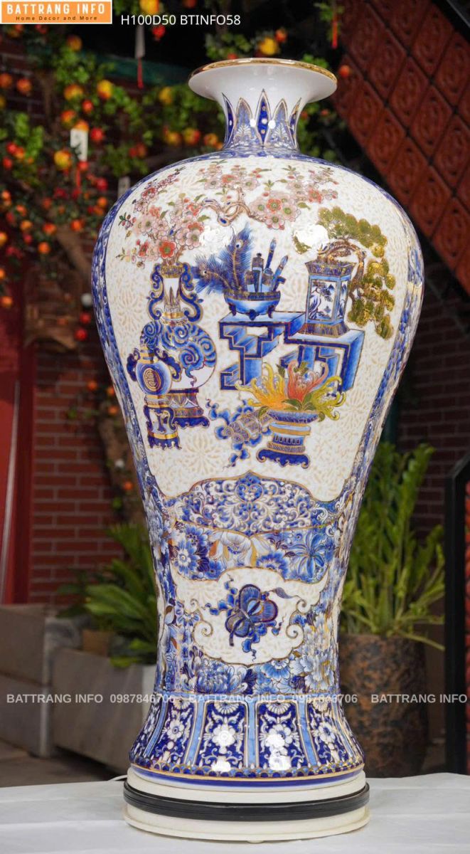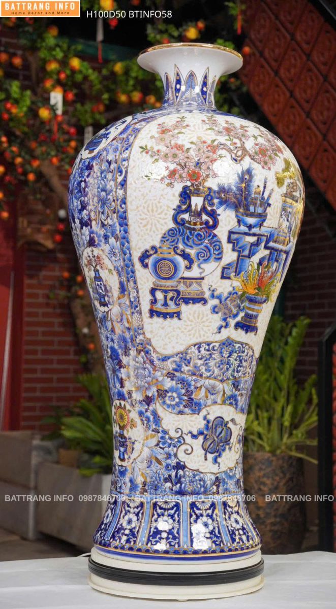 Mai bình Nhị Cảnh Cổ Đồ nền gấm vẽ vàng 24K cao 1m là dòng sản phẩm gốm sứ cao cấp bậc nhất của làng nghề Bát Tràng, hội tụ đầy đủ tinh hoa nghệ thuật tạo hình, hội họa và kỹ thuật vẽ vàng thủ công truyền thống. Tác phẩm không chỉ mang giá trị thẩm mỹ vượt trội mà còn chứa đựng ý nghĩa phong thủy sâu sắc, rất được giới sưu tầm, doanh nhân và gia chủ yêu thích. Sản phẩm phù hợp trưng bày tại phòng khách lớn, sảnh biệt thự, nhà thờ họ, khách sạn cao cấp hoặc làm quà biếu tặng sang trọng, đẳng cấp.