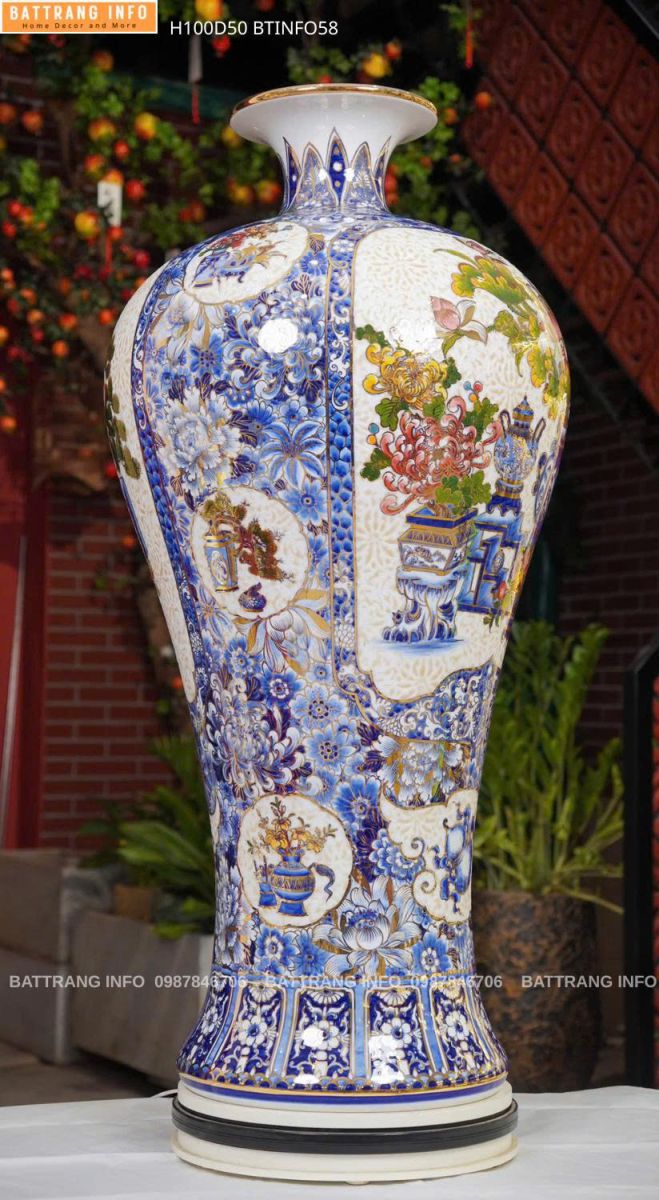 Mai Bình Nhị Cảnh Cổ Đồ Nền Gấm Vẽ Vàng 24K Cao 1m – Tinh Hoa Gốm Sứ Bát Tràng Cao Cấp