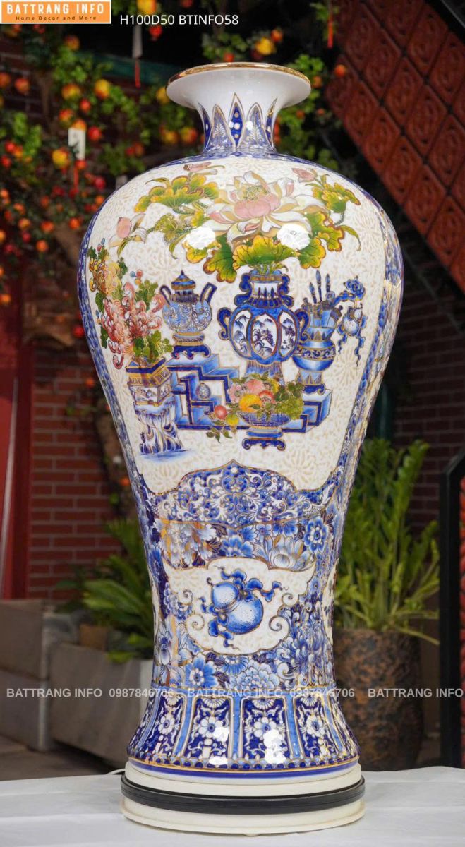 Mai bình Nhị Cảnh Cổ Đồ nền gấm vẽ vàng 24K cao 1m không chỉ là một sản phẩm gốm sứ trang trí, mà còn là tác phẩm nghệ thuật – vật phẩm phong thủy – biểu tượng của phú quý và trí tuệ. Sở hữu sản phẩm chính là sở hữu tinh hoa văn hóa Bát Tràng, khẳng định đẳng cấp và giá trị bền vững theo thời gian
