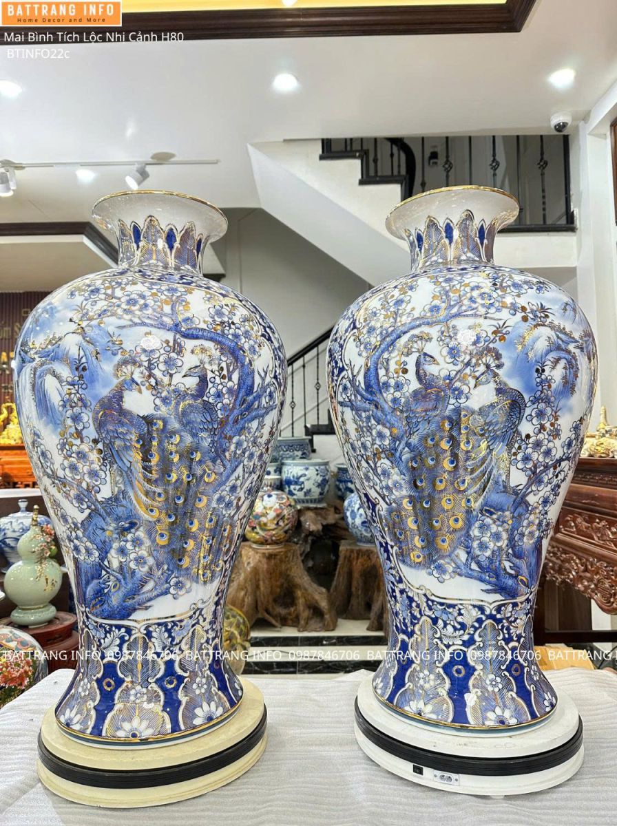 Mai Bình Tích Lộc Nhị Cảnh Tùng Hạc & Công Danh Phú Quý cao 80cm vẽ vàng 24K là dòng sản phẩm gốm sứ phong thủy cao cấp, được chế tác tinh xảo tại làng nghề Bát Tràng – cái nôi của gốm sứ truyền thống Việt Nam. Sản phẩm không chỉ mang giá trị nghệ thuật đỉnh cao mà còn chứa đựng ý nghĩa phong thủy sâu sắc, thích hợp trưng bày phòng khách, phòng làm việc, sảnh công ty hoặc làm quà biếu tặng sang trọng.