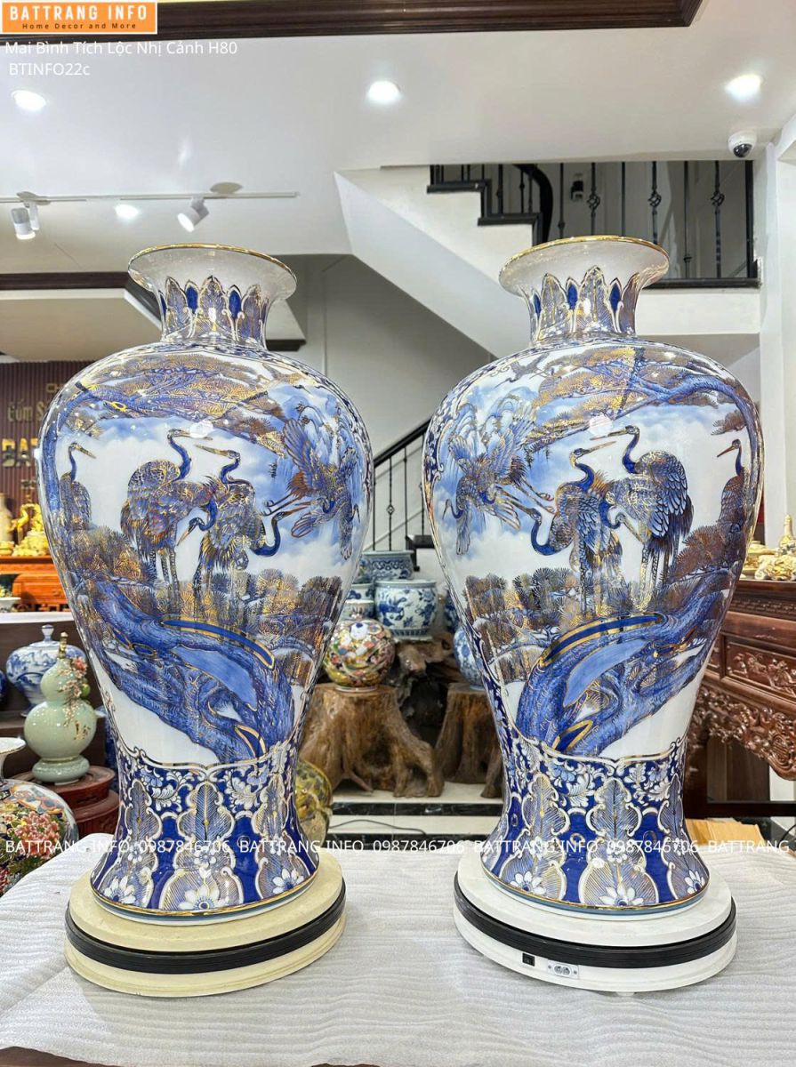 Mai Bình Tích Lộc Nhị Cảnh Tùng Hạc – Công Danh Phú Quý cao 80cm vẽ vàng 24K cao cấp Bát Tràng là sự kết tinh giữa nghệ thuật gốm truyền thống và tinh hoa phong thủy Á Đông. Với thiết kế sang trọng, ý nghĩa tốt lành và giá trị bền vững theo thời gian, đây chính là lựa chọn hoàn hảo cho không gian đẳng cấp và những món quà đầy ý nghĩa.