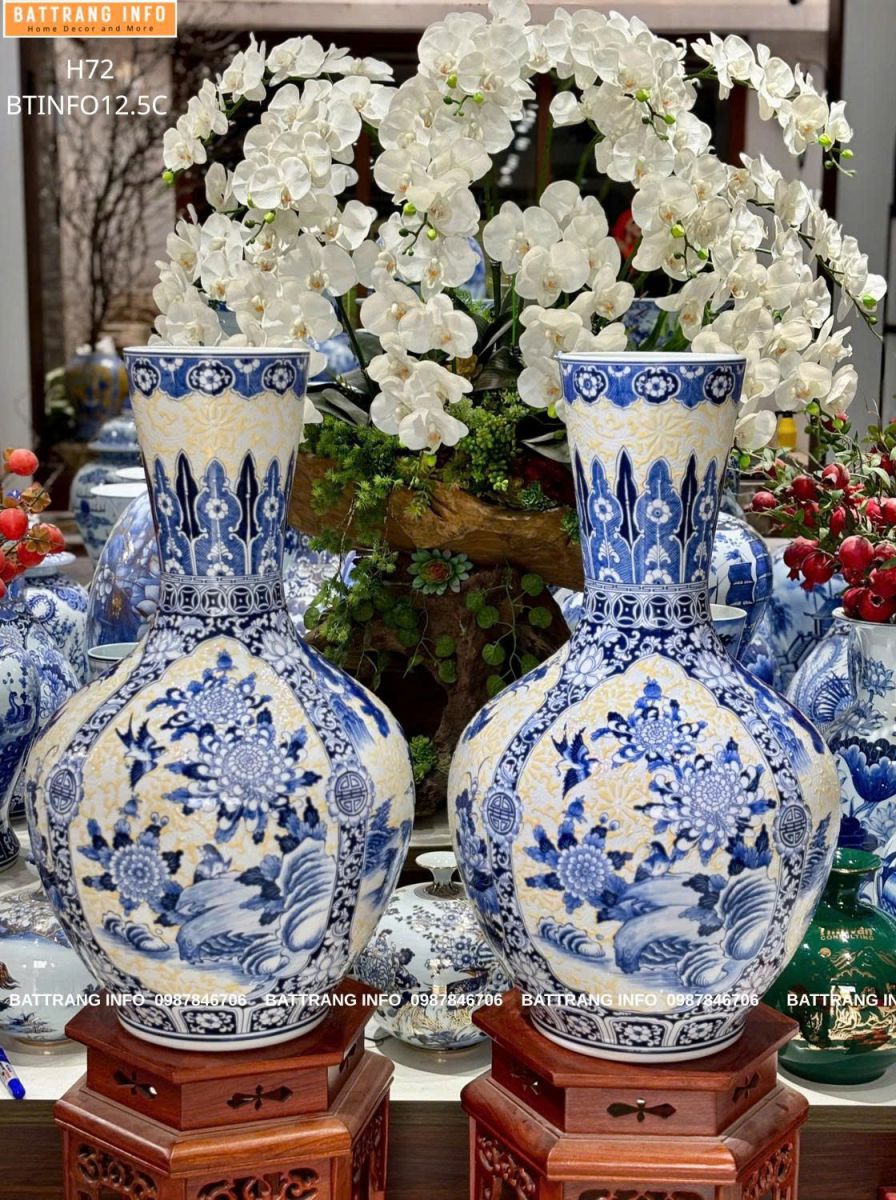 Sản phẩm nổi bật với dáng tỏi truyền thống, thân phình to, cổ cao vững chãi – biểu trưng cho sự tích tụ tài lộc và sinh khí. Toàn bộ thân tỏi được vẽ tay hoàn toàn bằng men lam cao cấp, thể hiện bốn bức tranh tứ cảnh Xuân – Hạ – Thu – Đông sinh động, hài hòa trên nền gấm sang trọng.