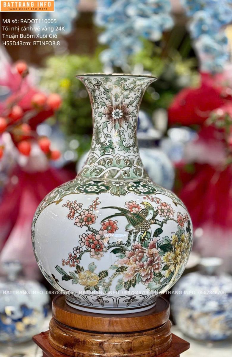 Tỏi nhị cảnh vẽ vàng Thuận Buồm Xuôi Gió là một trong những dòng lộc bình mini phong thủy được ưa chuộng nhất tại Bát Tràng. Sản phẩm không chỉ mang giá trị thẩm mỹ cao, mà còn chứa đựng ý nghĩa phong thủy sâu sắc, phù hợp trưng bày phòng khách, phòng làm việc, cửa hàng kinh doanh hoặc làm quà tặng tân gia – khai trương vô cùng ý nghĩa.