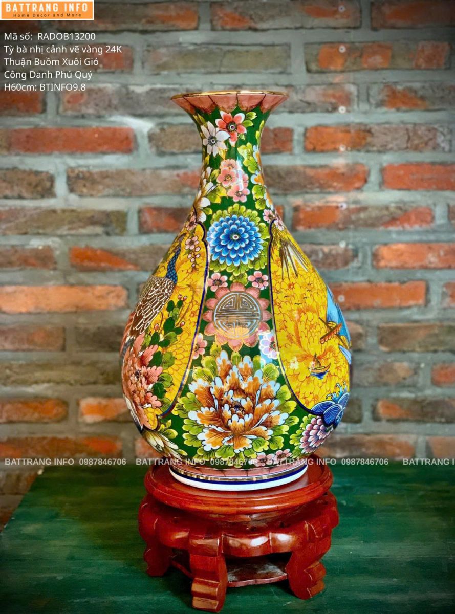 Tỳ Bà Nhị Cảnh vẽ vàng 24k là một trong những dòng sản phẩm cao cấp nhất của làng nghề gốm sứ Bát Tràng. Tác phẩm kết hợp hai cảnh phong thủy nổi tiếng: • Thuận Buồm Xuôi Gió – tượng trưng cho hanh thông, may mắn, làm ăn phát đạt. • Công Danh Phú Quý – biểu tượng cho tài lộc, thăng tiến, vinh hoa bền vững. Chiều cao 60cm, thân tỳ bà dáng sang trọng, họa tiết vẽ tay tỉ mỉ, phủ vàng kim 24K, mang ý nghĩa thu hút tài lộc – trấn trạch – chiêu vượng khí.